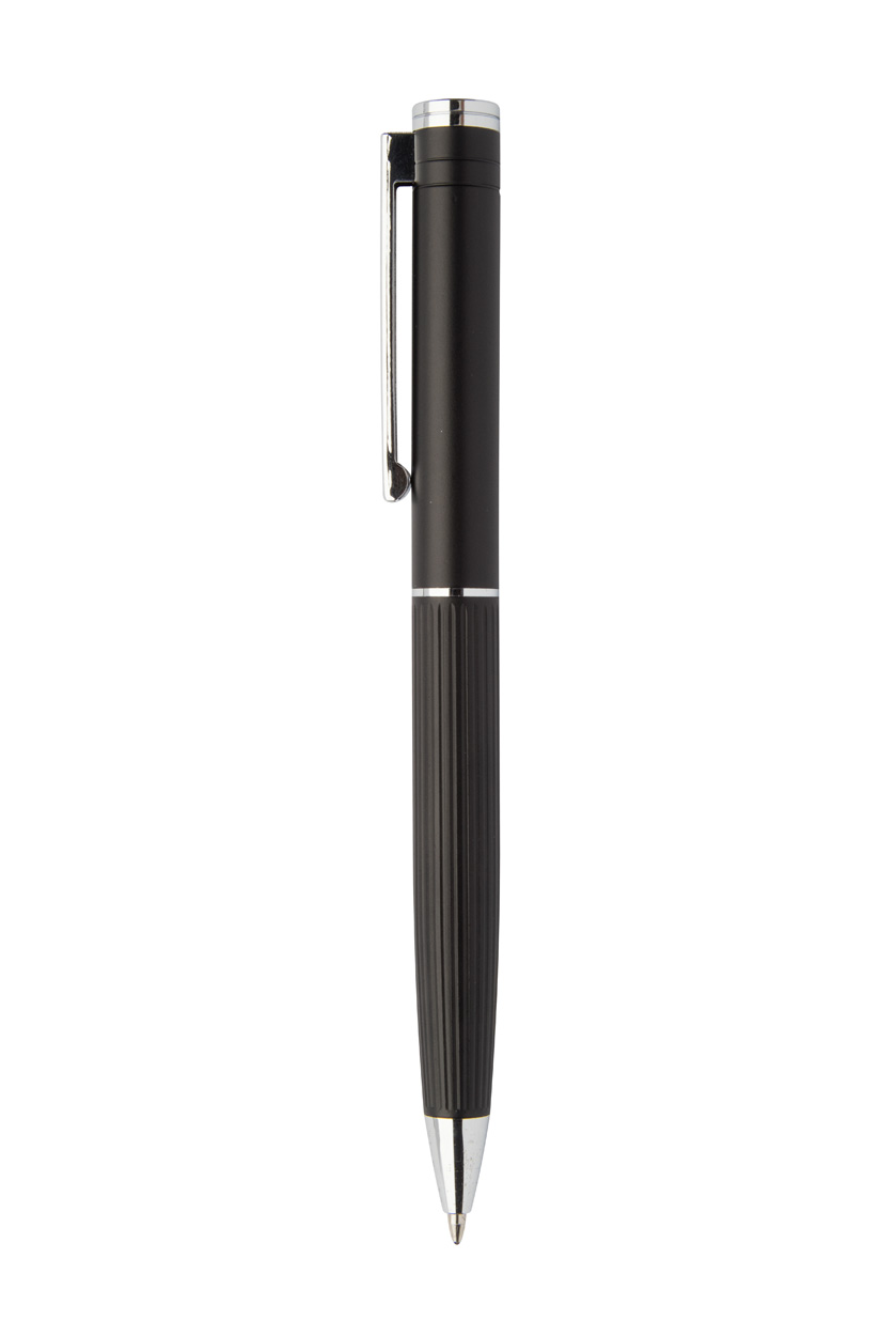 Elegantní sada hliníkového kuličkového pera a rolleru s proužkovaným tubusem. V černé dárkové krabičce, s modrou náplní.