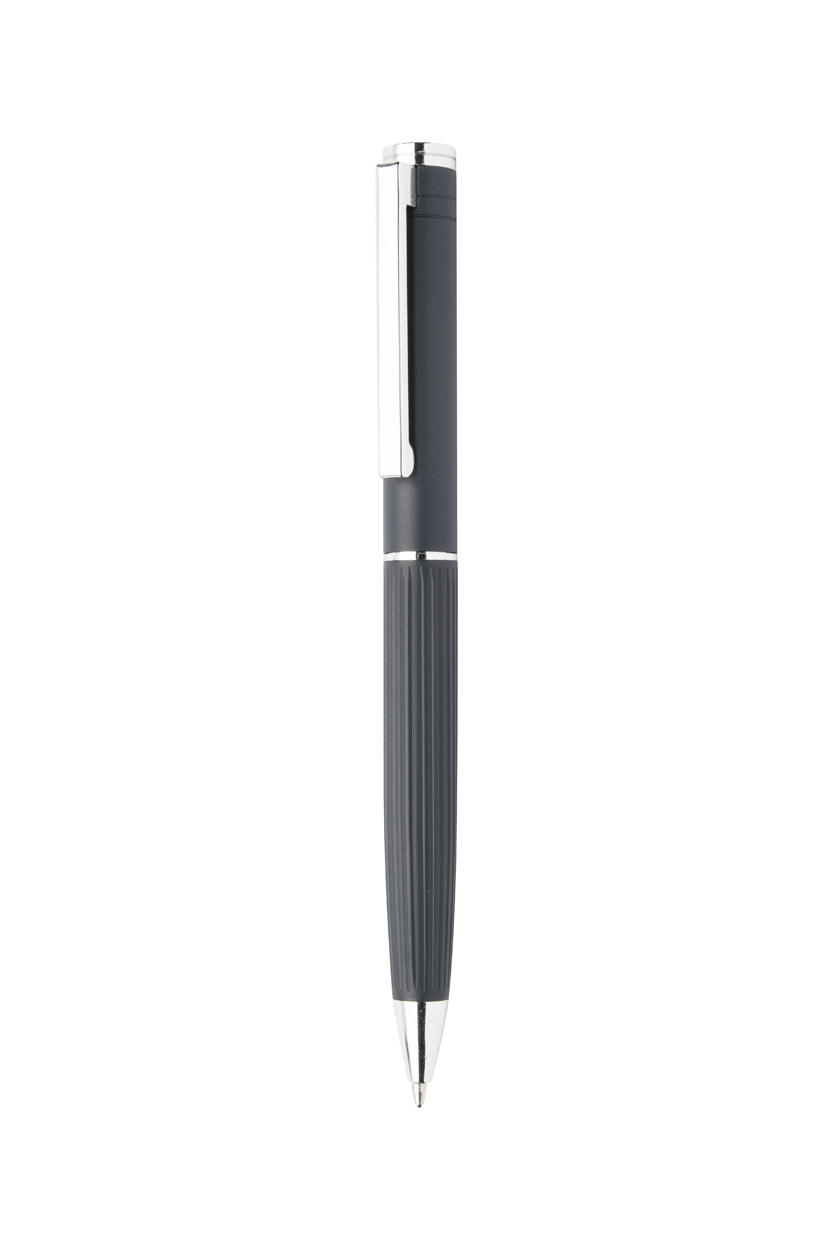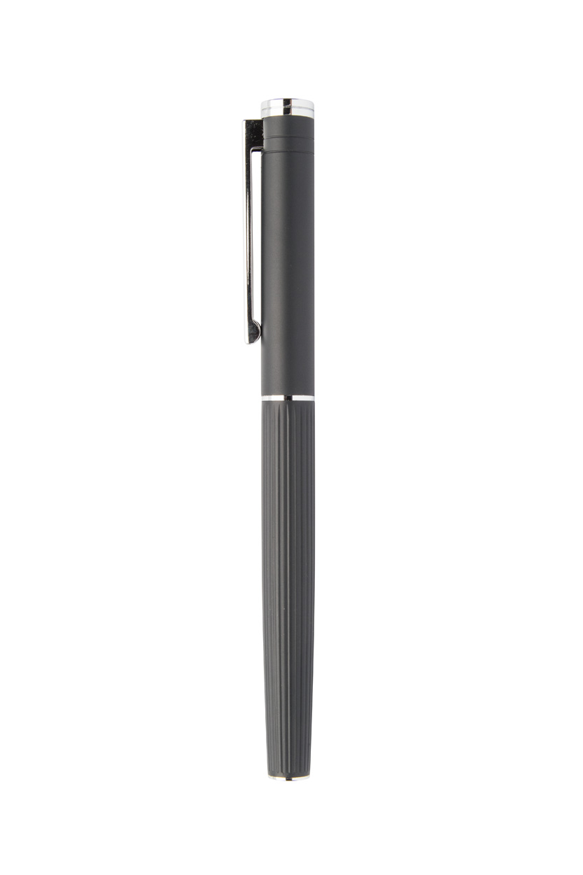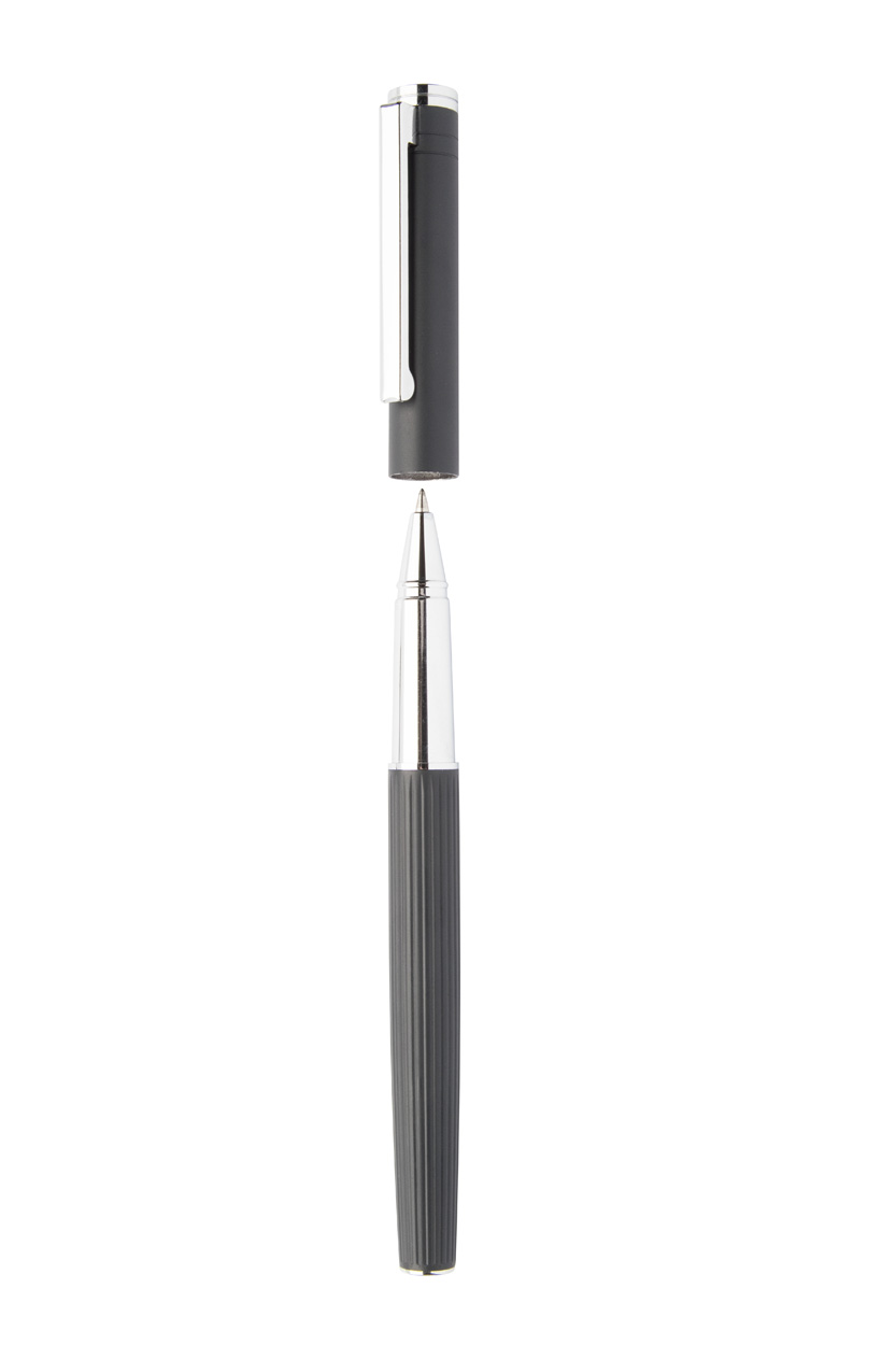 Elegantní sada hliníkového kuličkového pera a rolleru s proužkovaným tubusem. V černé dárkové krabičce, s modrou náplní.