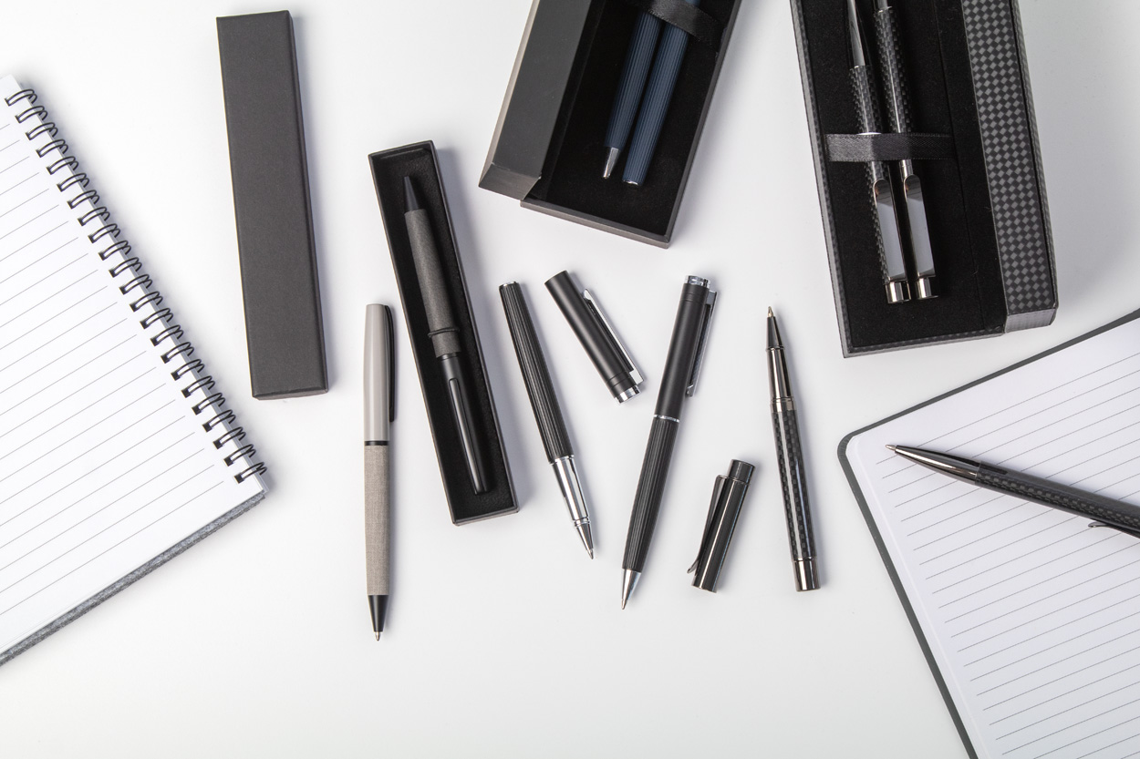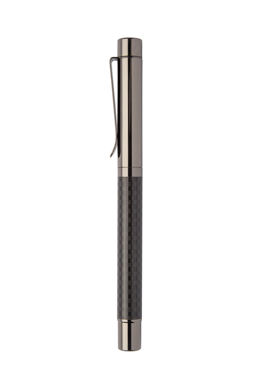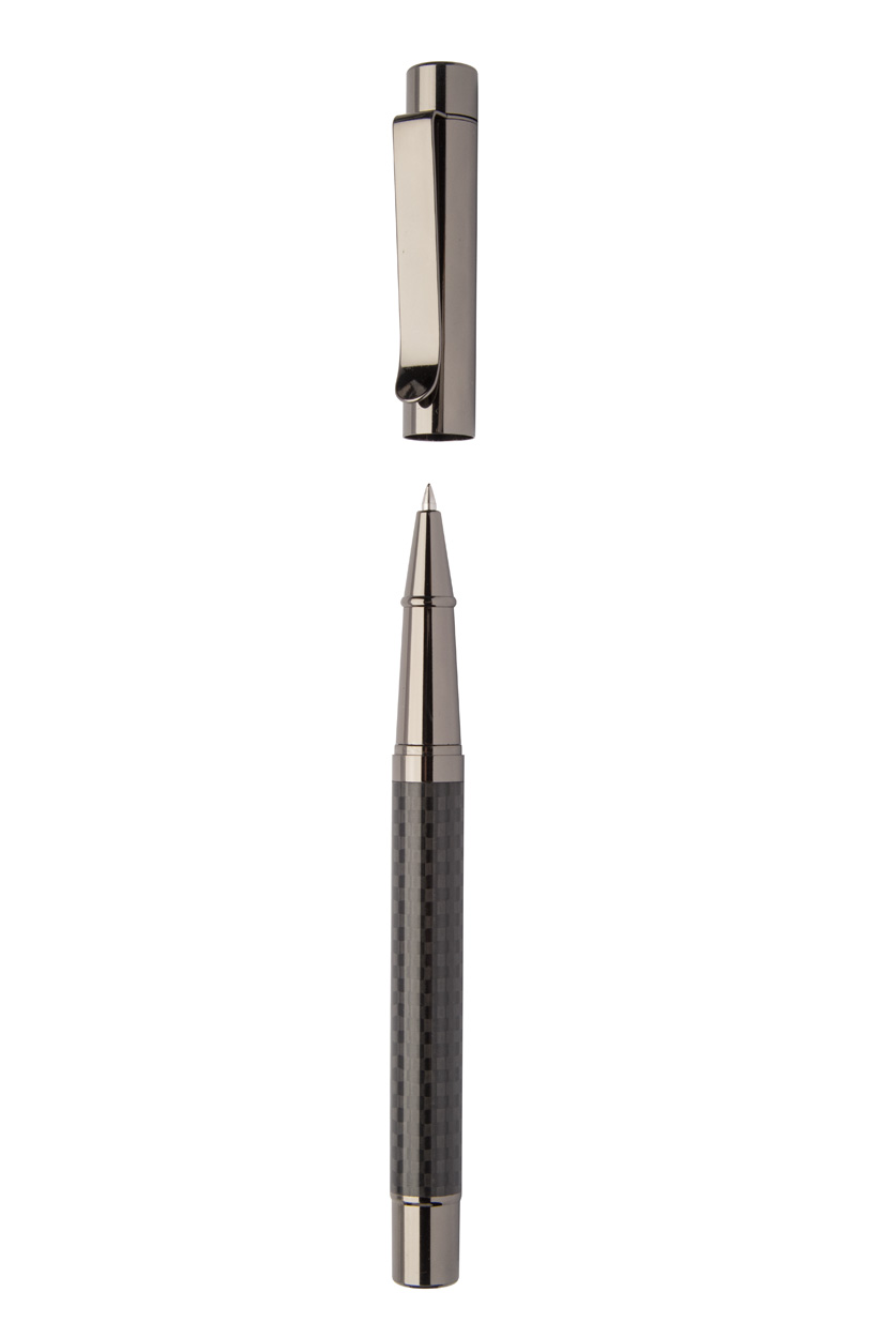 Elegantní, kovová sada kuličkového pera a rolleru s karbonovým vzorovaným tubusem a díly z červeného kovu. V dárkové krabičce s karbonovým vzorem, s modrou náplní.