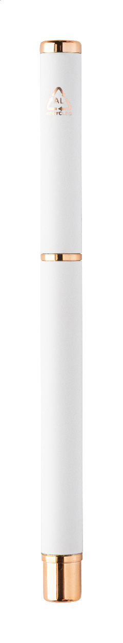 Sada per z recyklovaného hliníku s kuličkovým perem a rollerem s pogumovaným povrchem a detaily růžového zlata. S modrou náplní. Se speciálním povrchem pro zrcadlové laserové gravírování v růžovo-zlaté barvě. V černé papírové dárkové krabičce.