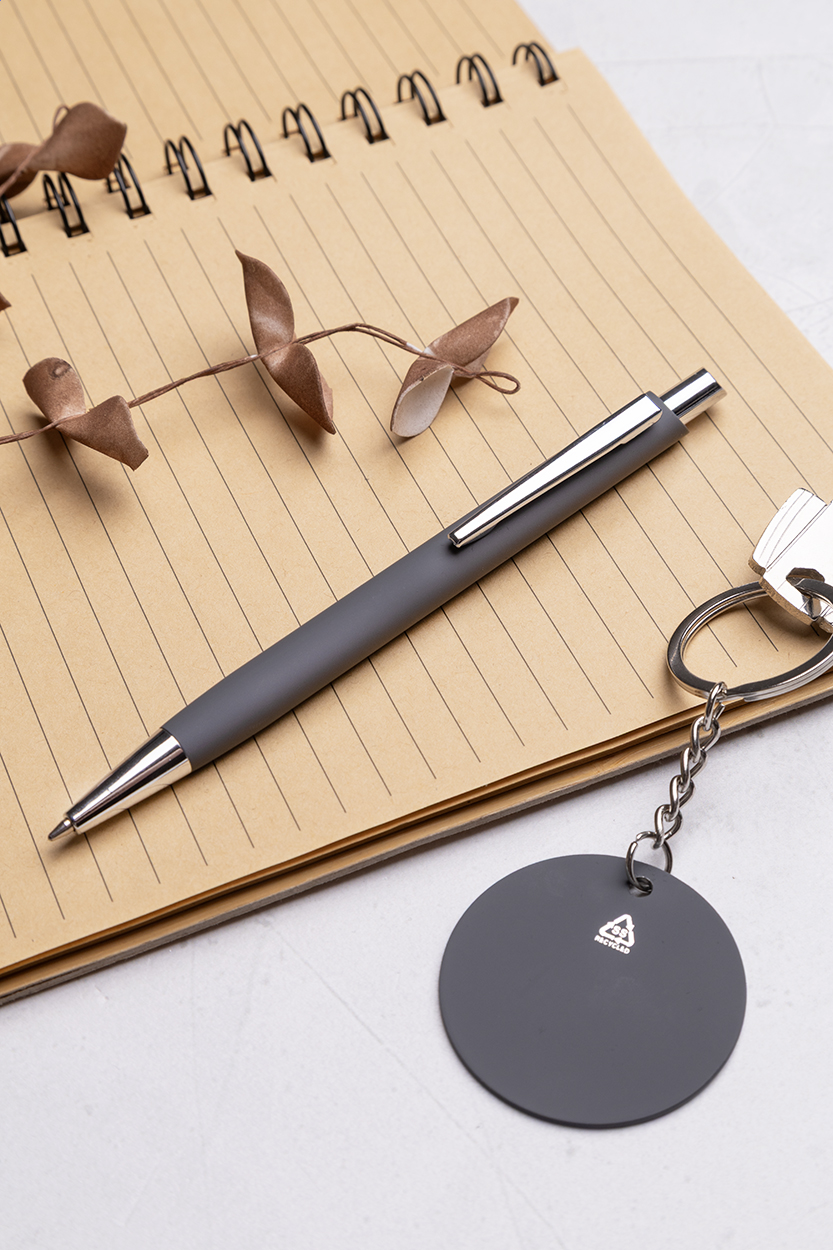 2dílná dárková sada v černé papírové dárkové krabičce. Včetně kuličkového pera z recyklovaného hliníku s pogumovaným povrchem a modrou náplní a přívěsku na klíče z recyklované nerezové oceli s pogumovaným povrchem. Obě položky mají speciální povrchovou úpravu pro zrcadlové laserové gravírování.