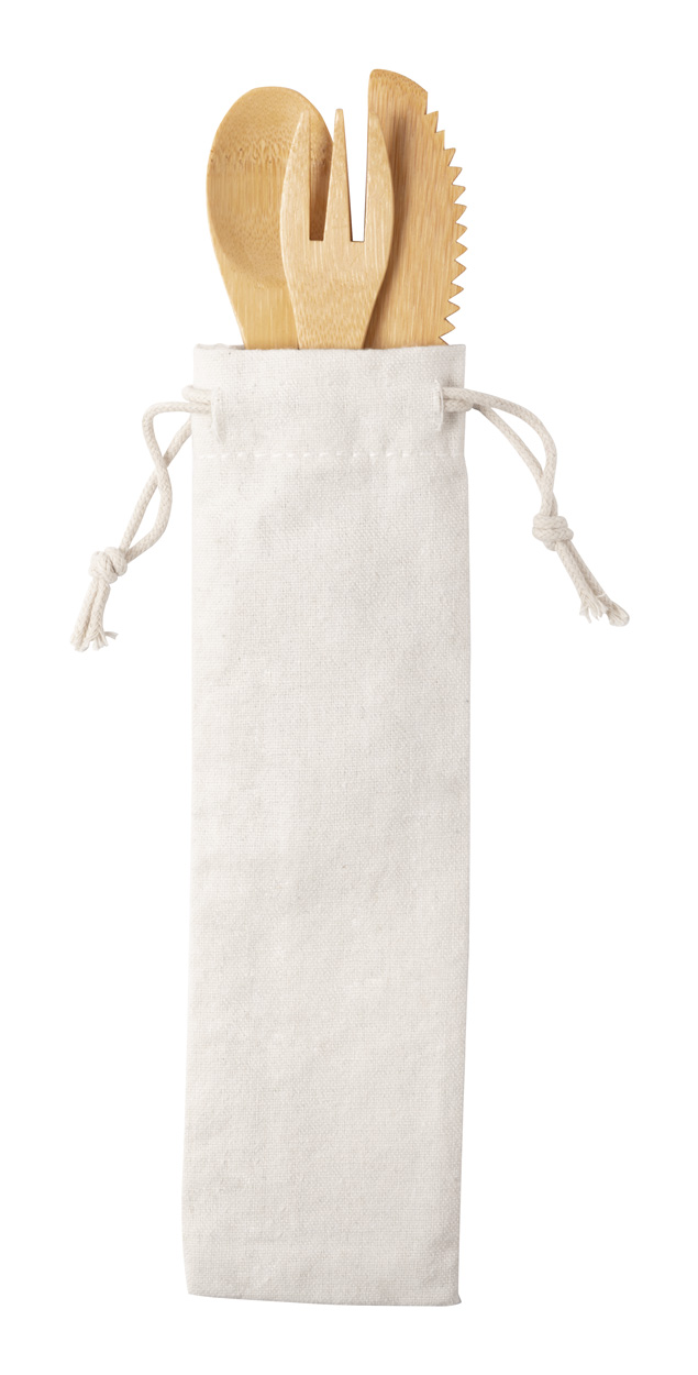 Sada 3ks příborů z bambusu v bavlněném obalu.
