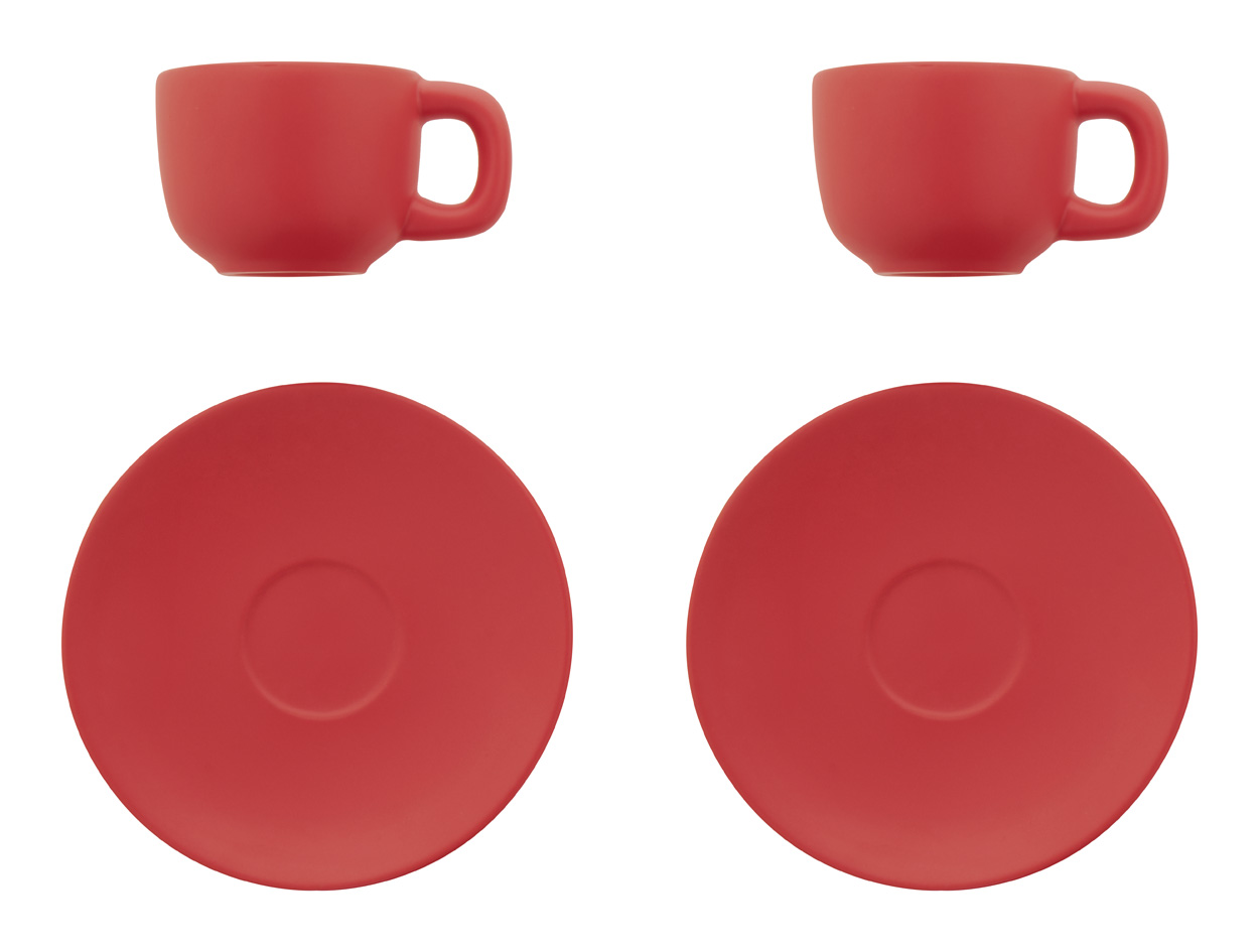 Vysoce kvalitní sada keramických šálků na espresso se 2 šálky a podšálky. S matnou vnější a lesklou vnitřní povrchovou úpravou. 85 ml. V kraftové papírové krabici.