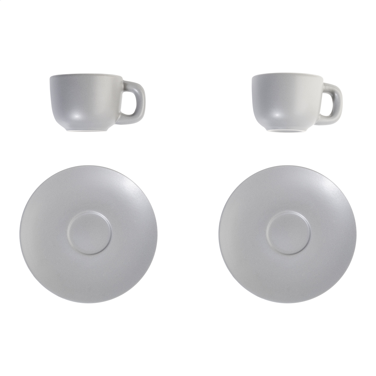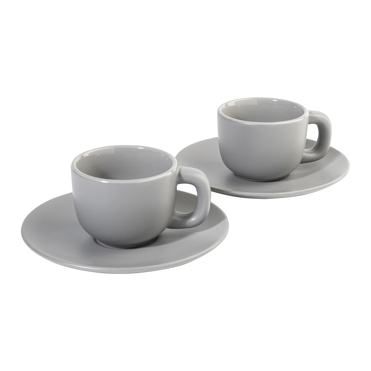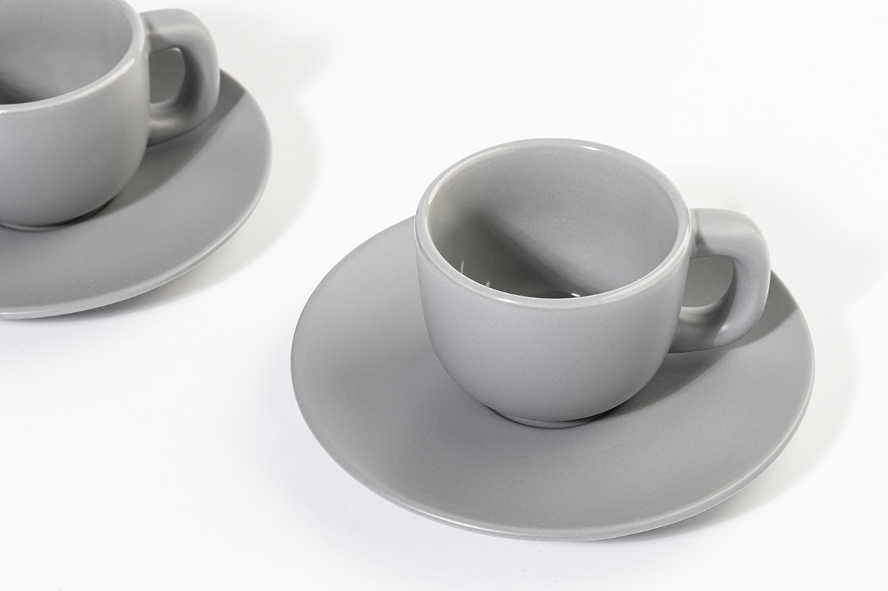 Vysoce kvalitní sada keramických šálků na espresso se 2 šálky a podšálky. S matnou vnější a lesklou vnitřní povrchovou úpravou. 85 ml. V kraftové papírové krabici.