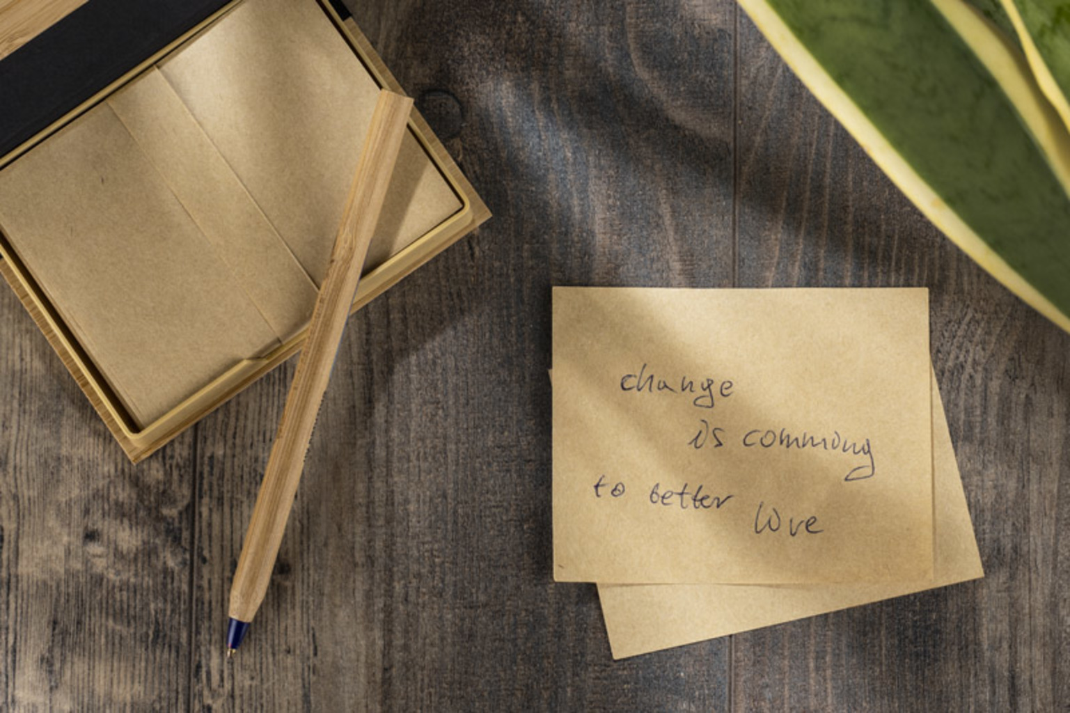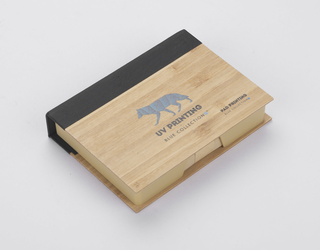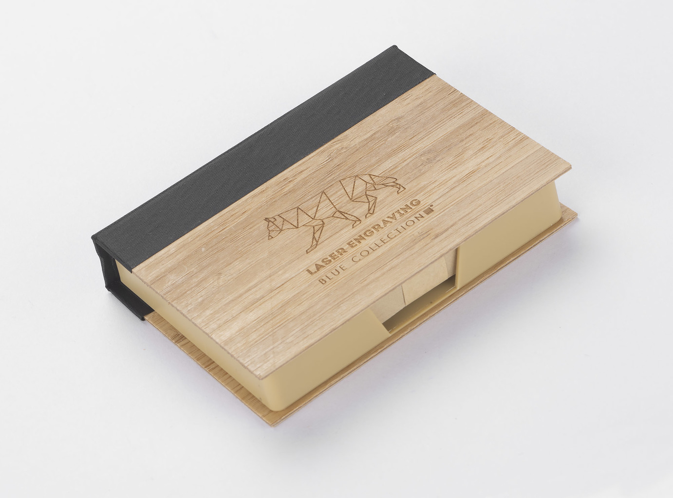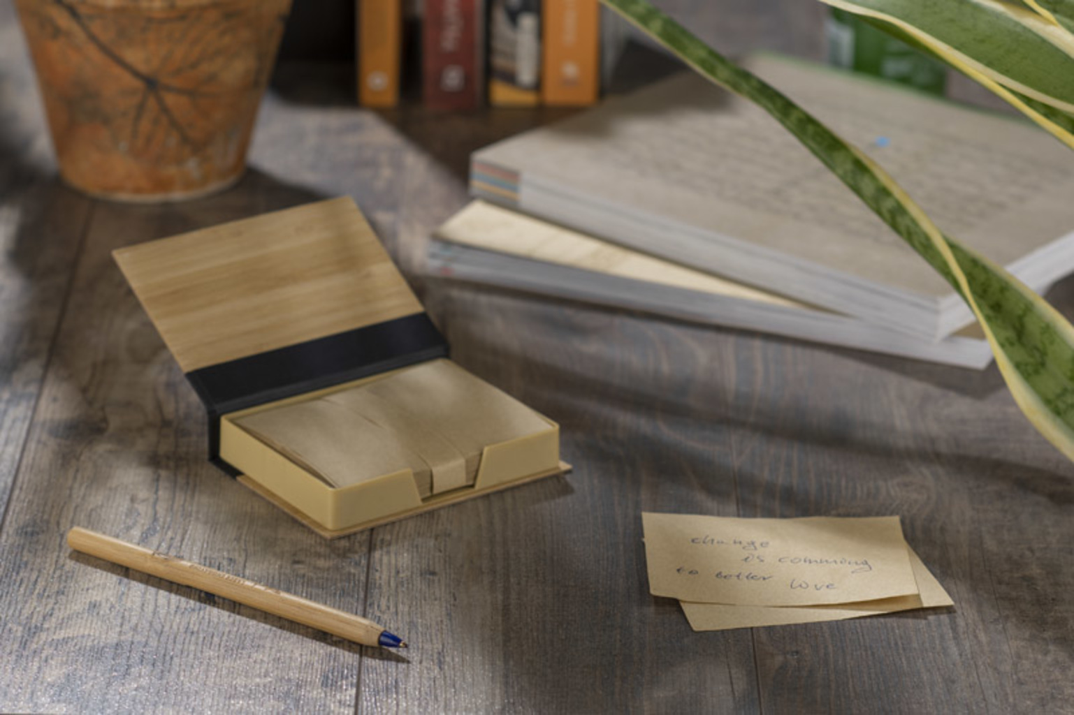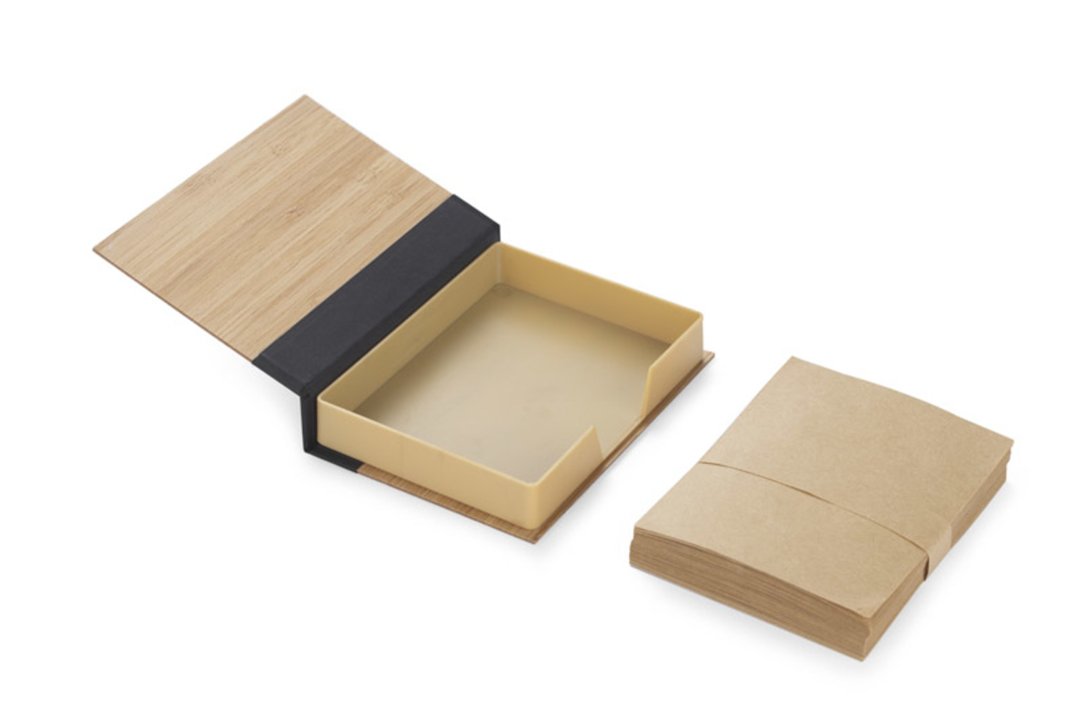 Sada psacích potřeb zabalená v pouzdře z bambusu. Sada obsahuje hnědé bločky na poznámky.