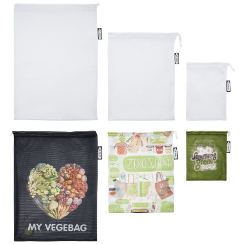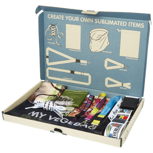 Sada sublimačních vzorků obsahující 3 sáčky na zeleninu v různých velikostech (15x21 - 1PL035, 25x32 cm - 1PL036, 30x41 cm - 1PL037), vše vyrobené ze 100% recyklovaného polyesteru. Sada dále obsahuje pár tkaniček (98x1 cm), multišátek (49x23 cm), čisticí hadřík (18x18 cm), pásek na zavazadla (154x4 cm), šňůrku s háčkem (98x2 cm), 2 šňůrky s bezpečnostní sponou a háčkem (104x2,5 cm/94x1,5 cm), klíčenku (34x1,5 cm), náramek s uzamykacím jezdcem (32x1,5 cm) a náramek s odnímatelným uzamykacím jezdcem (32x1,5 cm). Vyrobeno v Evropě.