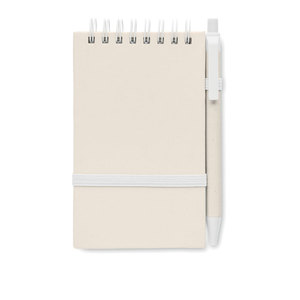 Blok A6 se 70 listy z nelinkovaného papíru (70 % recyklovaných kartonů od mléka a 30 % recyklovaného papíru). Kroužková vazba. Odpovídající kuličkové pero. Modrý inkoust. Zavírací gumička a držák na pero.