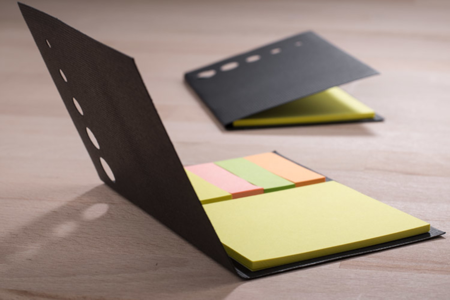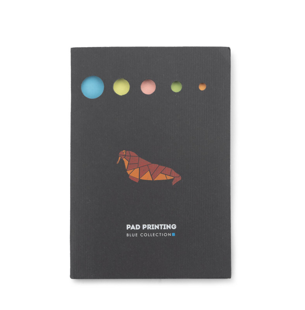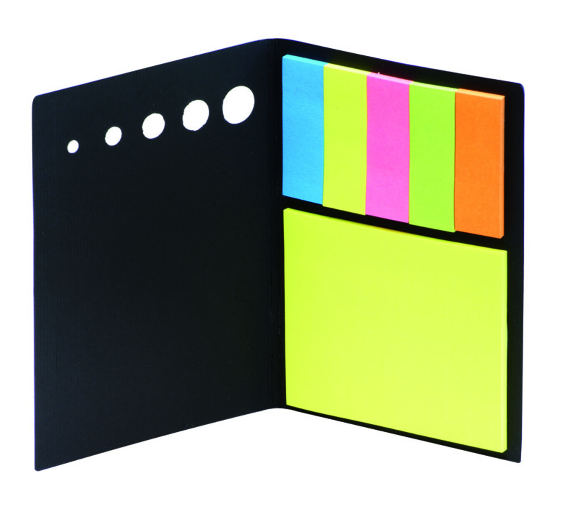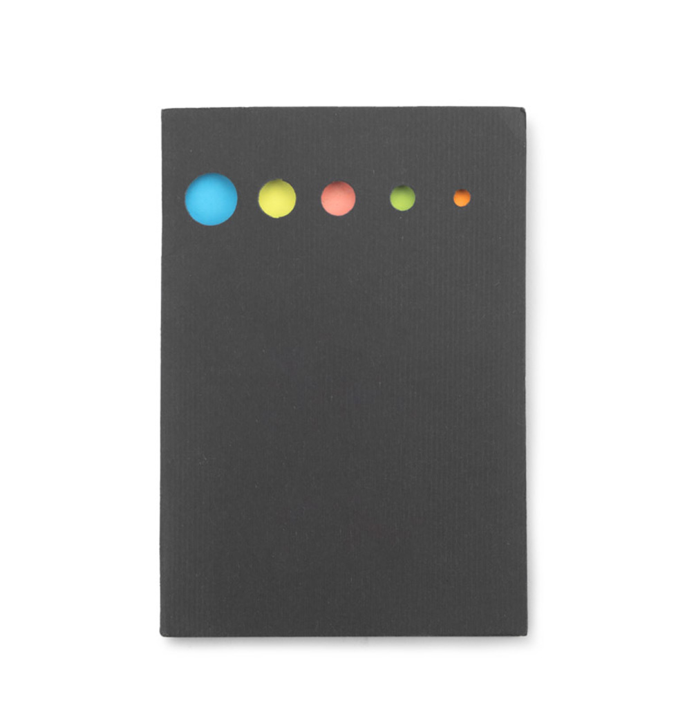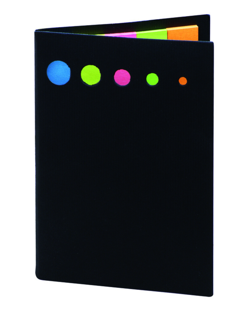Spojte 5 barevných papírových listů s sebou pomocí sešitu a umístěte je do černého obalu. Logo by mohlo být tisknuto na obal.