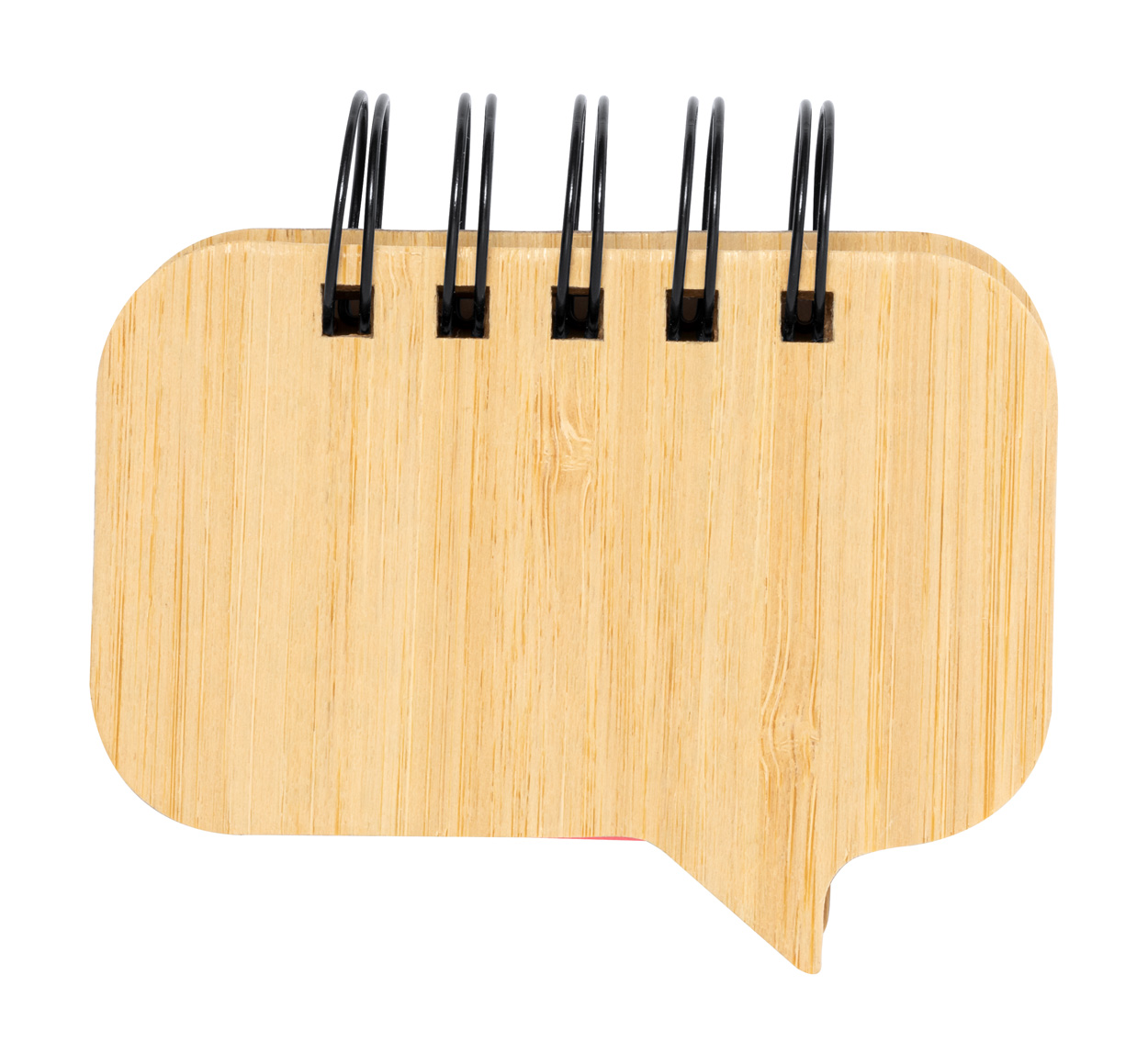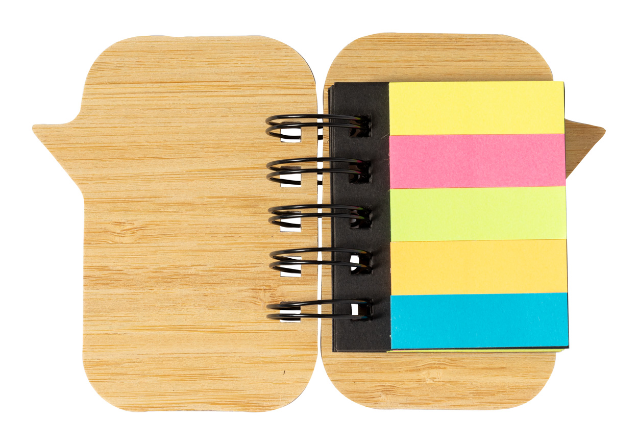 Poznámkový blok ve spirále potažený bambusem se 100 velkými lepicími papírky (ve 4 různých barvách) a 125 značkami stránek (v 5 různých barvách).