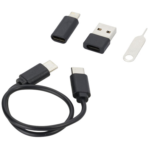 Modulární kabel pro přenos dat a nabíjení vyrobený z recyklovaného plastu a dodávaný v elegantním úložném boxu, který funguje také jako stojánek na telefon. Kabel nabízí několik řešení nabíjení: Vstup Typ-C a USB-A a výstup Typ-C/iOS/mikro USB. Díky všem těmto adaptérům a konektorům umožňuje tento kabel nabíjet většinu smartphonů, fotoaparátů, power bank, sluchátek atd. Kabel má maximální výstupní proud 2A. Obsahuje vysunovací kolík, který se hodí, kdykoli potřebujete vyjmout SIM kartu telefonu. Úložný box má také prostor pro uložení paměťové karty micro SD a nano SIM karty, což z něj dělá perfektní cestovní doplněk. Délka kabelu: 26 cm. Dodáváno v obálce ze 100% recyklovaného kraftového papíru.