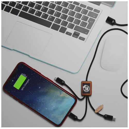 Bambusový kabel 3 v 1 v délce 1 metr a 3 konektory (typ C, mikro USB, iPhone). Může být zdoben rozsvíceným logem na obou stranách. Dodáváno v sáčku TPU s kartou z kraftového papíru.