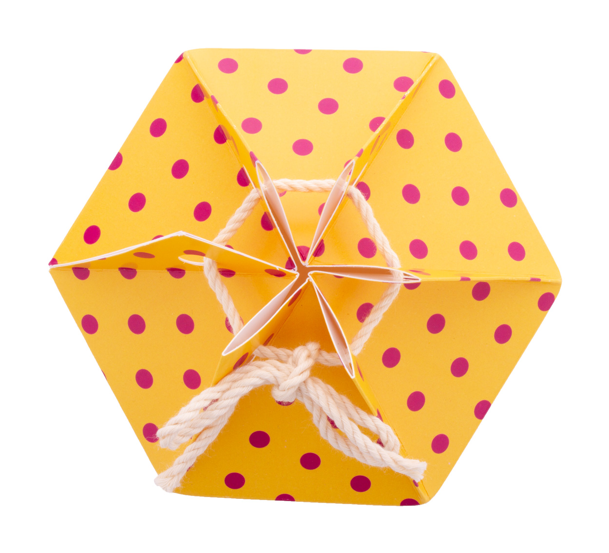 Na zakázku vyrobená, plnobarevně potištěná kartonová šestihranná dárková krabička s provázkovým uzávěrem. Dodáváno rozložené. Cena zahrnuje digitální tisk, nezahrnuje tiskovou přípravu. Min. mn.: 50 ks.