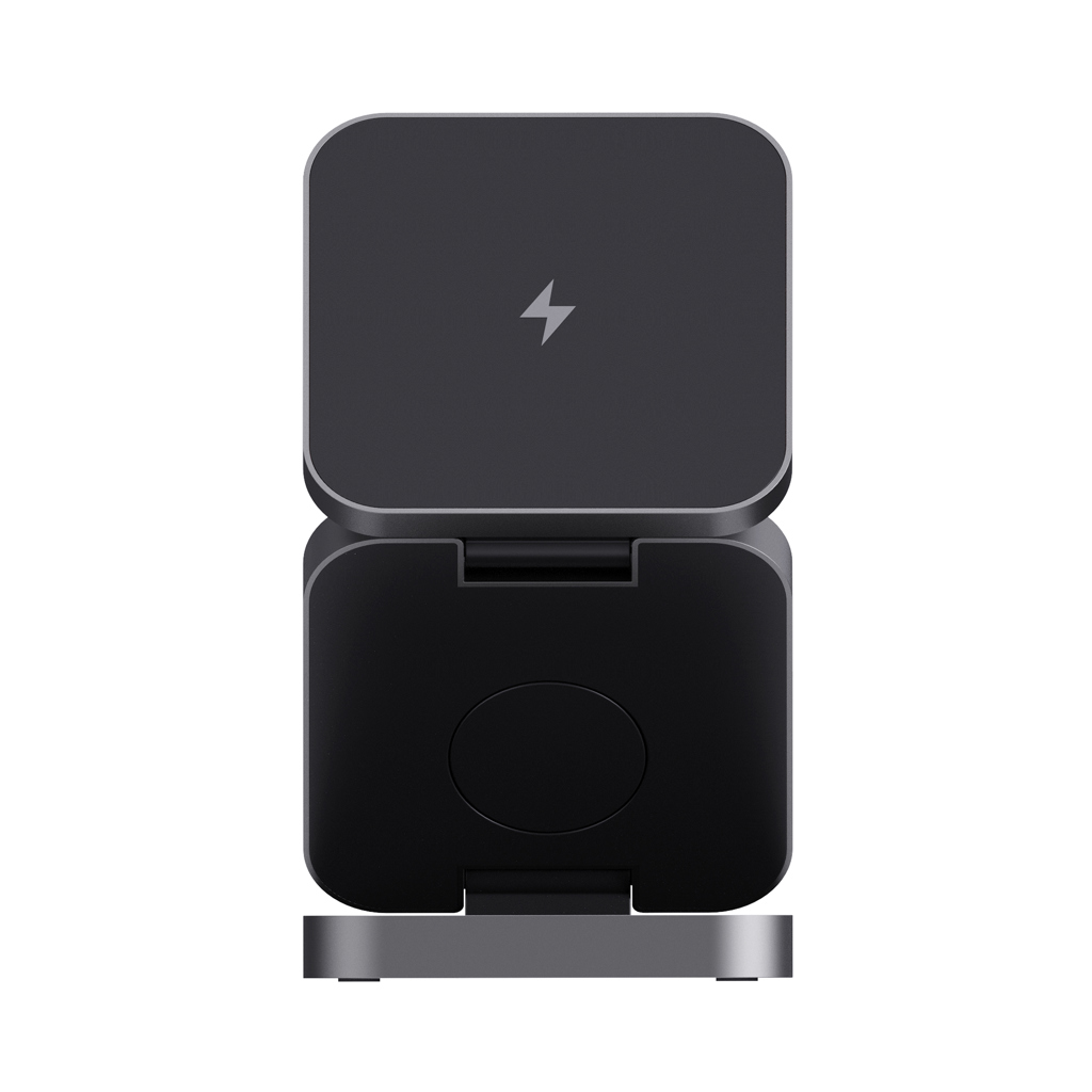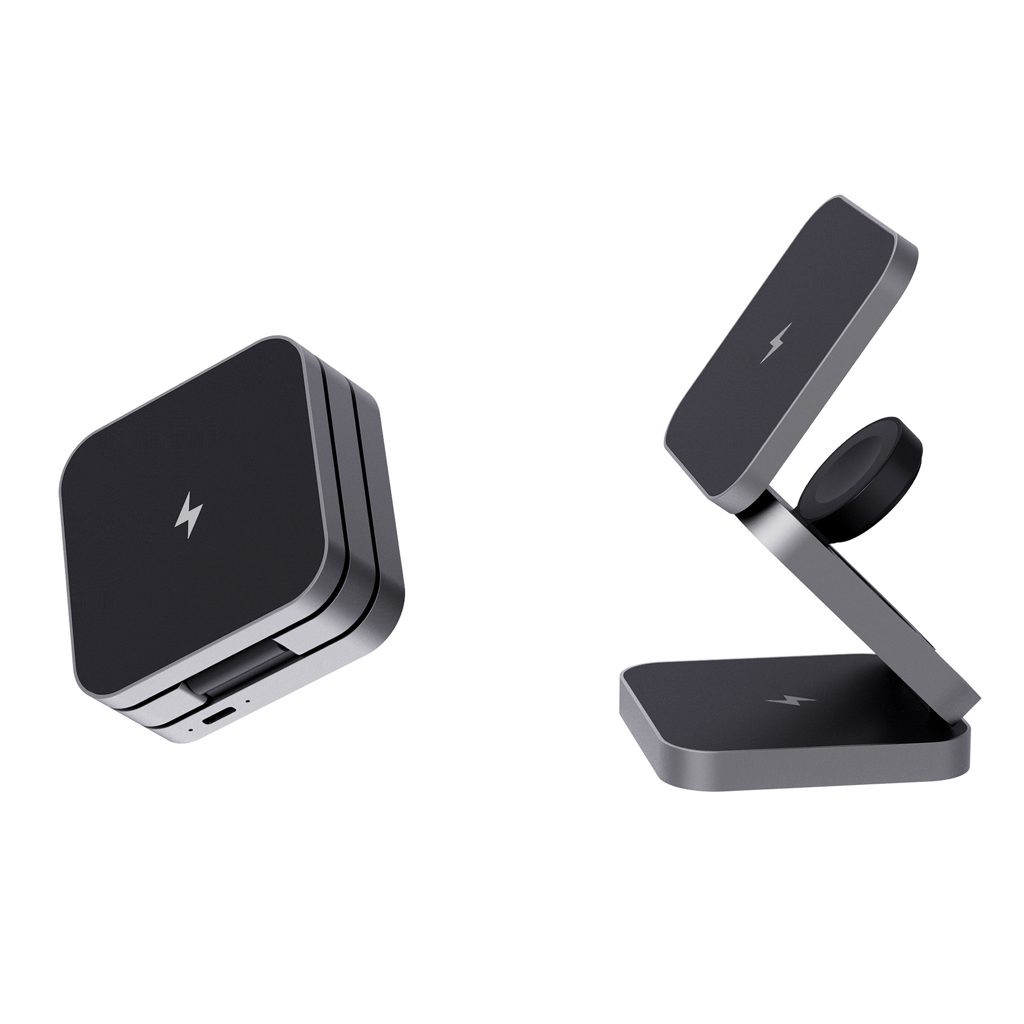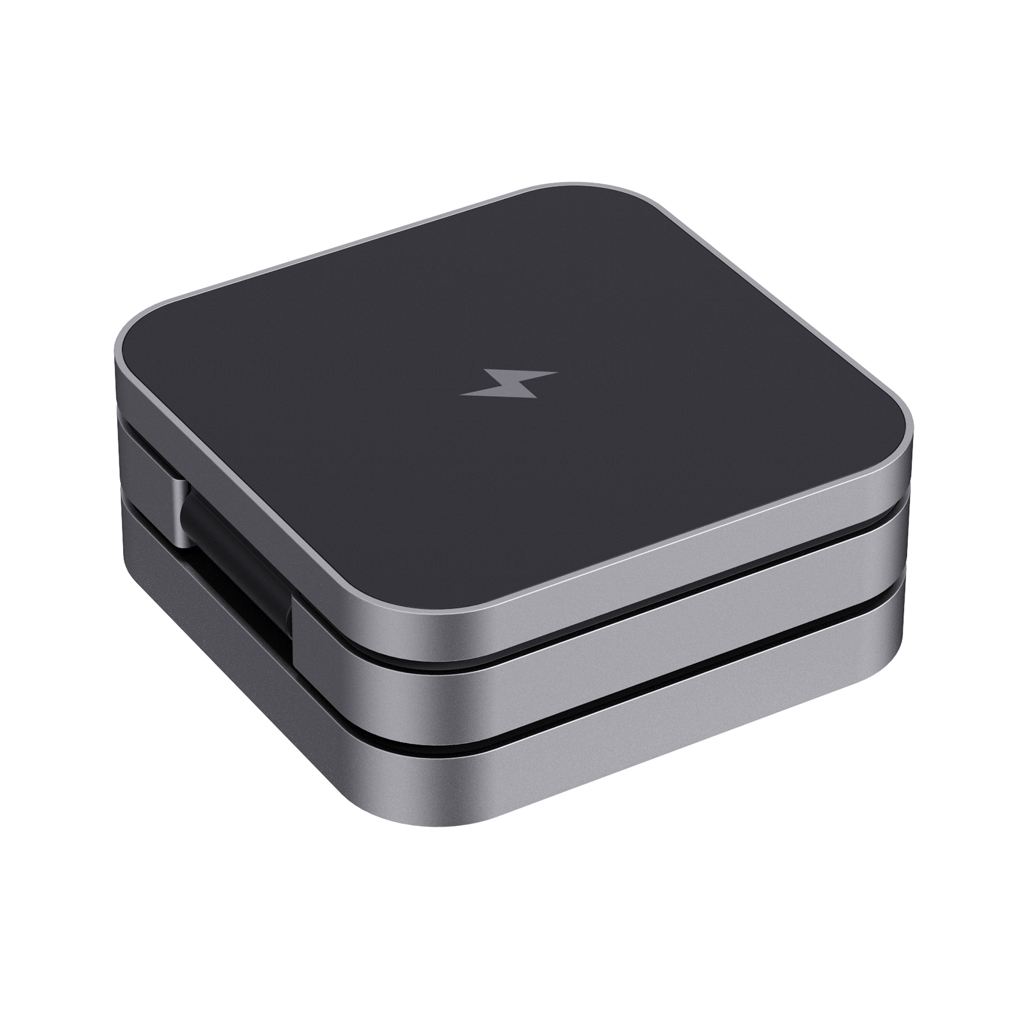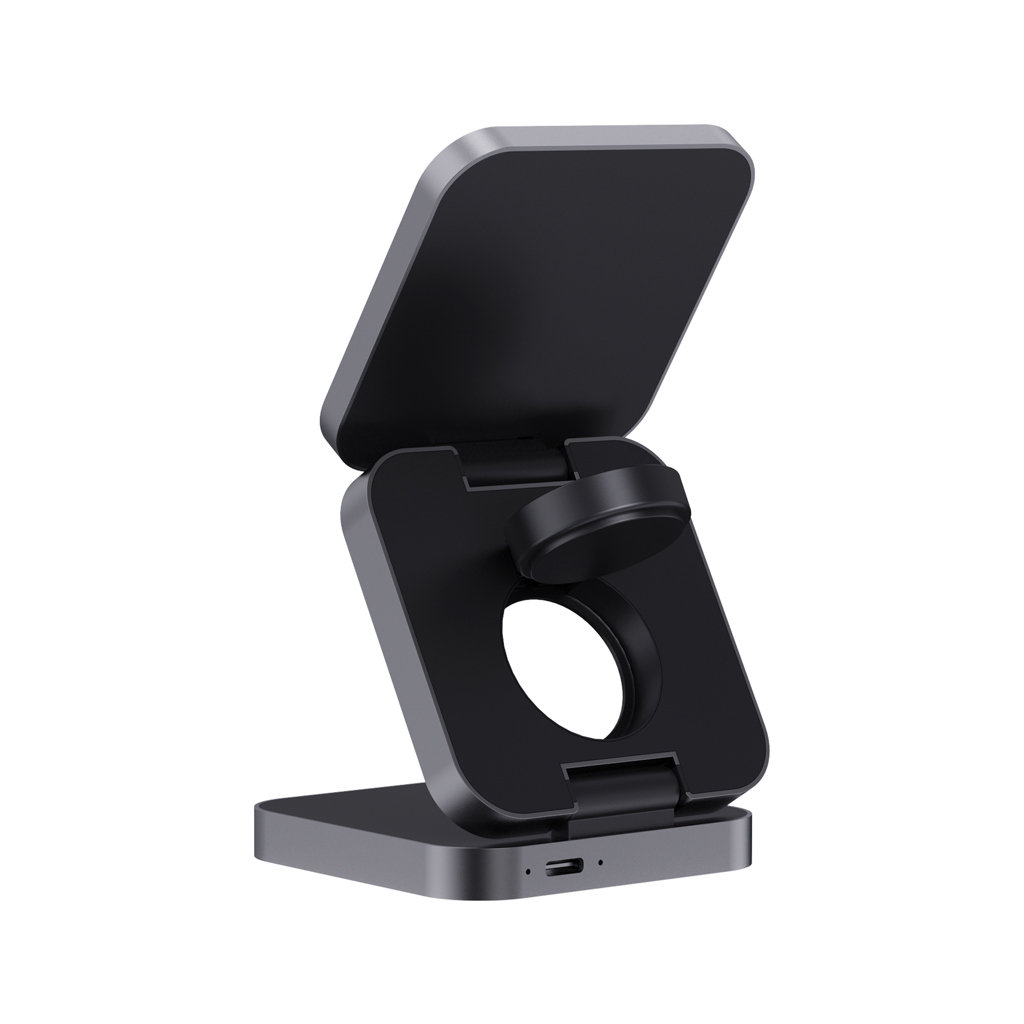 Skládací bezdrátová nabíječka 3 v 1. Magnetická 15 W část pro větší zařízení, 5 W část pro menší zařízení (např. sluchátka), 2,5 W část pro chytré hodinky (pouze Apple Watch). Vyrobené z RCS recyklovaného ABS a hliníku. Celkový podíl recyklátu dle váhy produktu: 38 %. RCS certifikace zajišťuje garanci použití recyklovaného materiálu díky transparentnímu přehledu nad dodavatelským řetězcem. Včetně 120cm USB C kabelu z RCS recyklovaného TPE. Baleno v FSC® kraftové krabičce. Vstup pro optimální použití: 9V/3A. Výstup: velká část: 9V/1.1A; 9V/1.67A (15W), střední část: 5V/1A (5W), část na hodinky: 5V/0.5A (2.5W). Bez PVC.