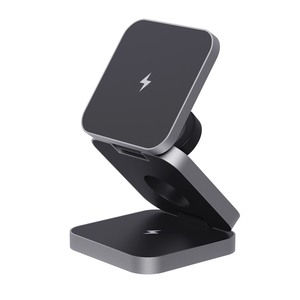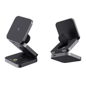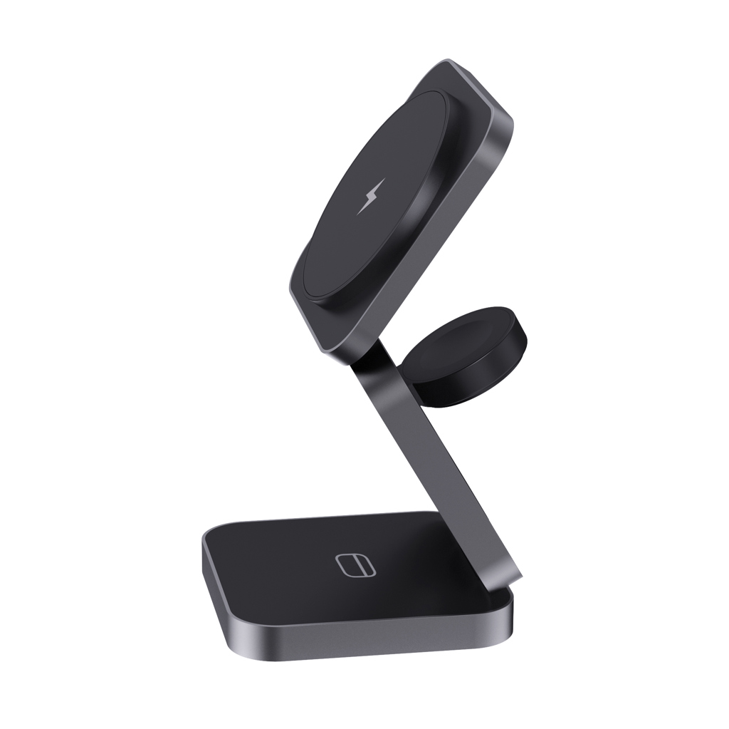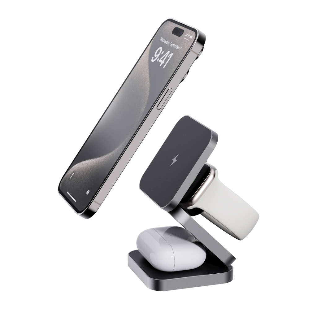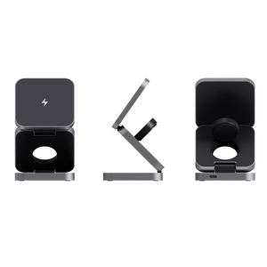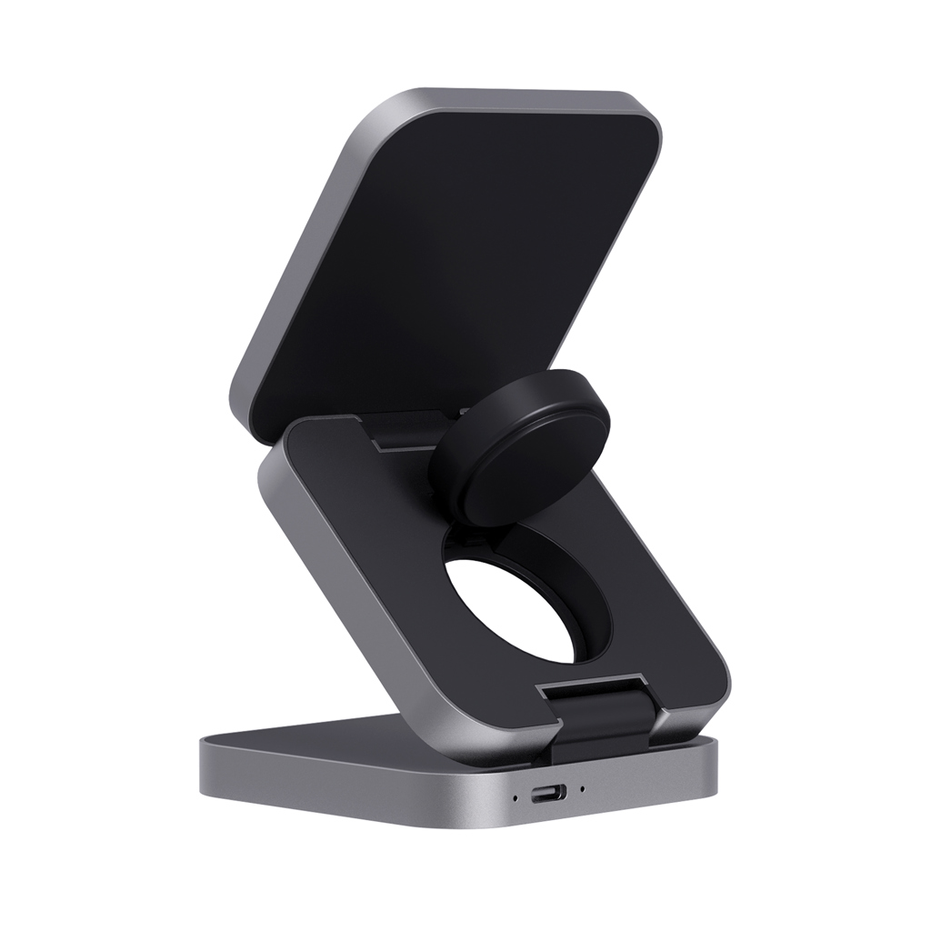 Skládací bezdrátová nabíječka 3 v 1. Magnetická 15 W část pro větší zařízení, 5 W část pro menší zařízení (např. sluchátka), 2,5 W část pro chytré hodinky (pouze Apple Watch). Vyrobené z RCS recyklovaného ABS a hliníku. Celkový podíl recyklátu dle váhy produktu: 38 %. RCS certifikace zajišťuje garanci použití recyklovaného materiálu díky transparentnímu přehledu nad dodavatelským řetězcem. Včetně 120cm USB C kabelu z RCS recyklovaného TPE. Baleno v FSC® kraftové krabičce. Vstup pro optimální použití: 9V/3A. Výstup: velká část: 9V/1.1A; 9V/1.67A (15W), střední část: 5V/1A (5W), část na hodinky: 5V/0.5A (2.5W). Bez PVC.