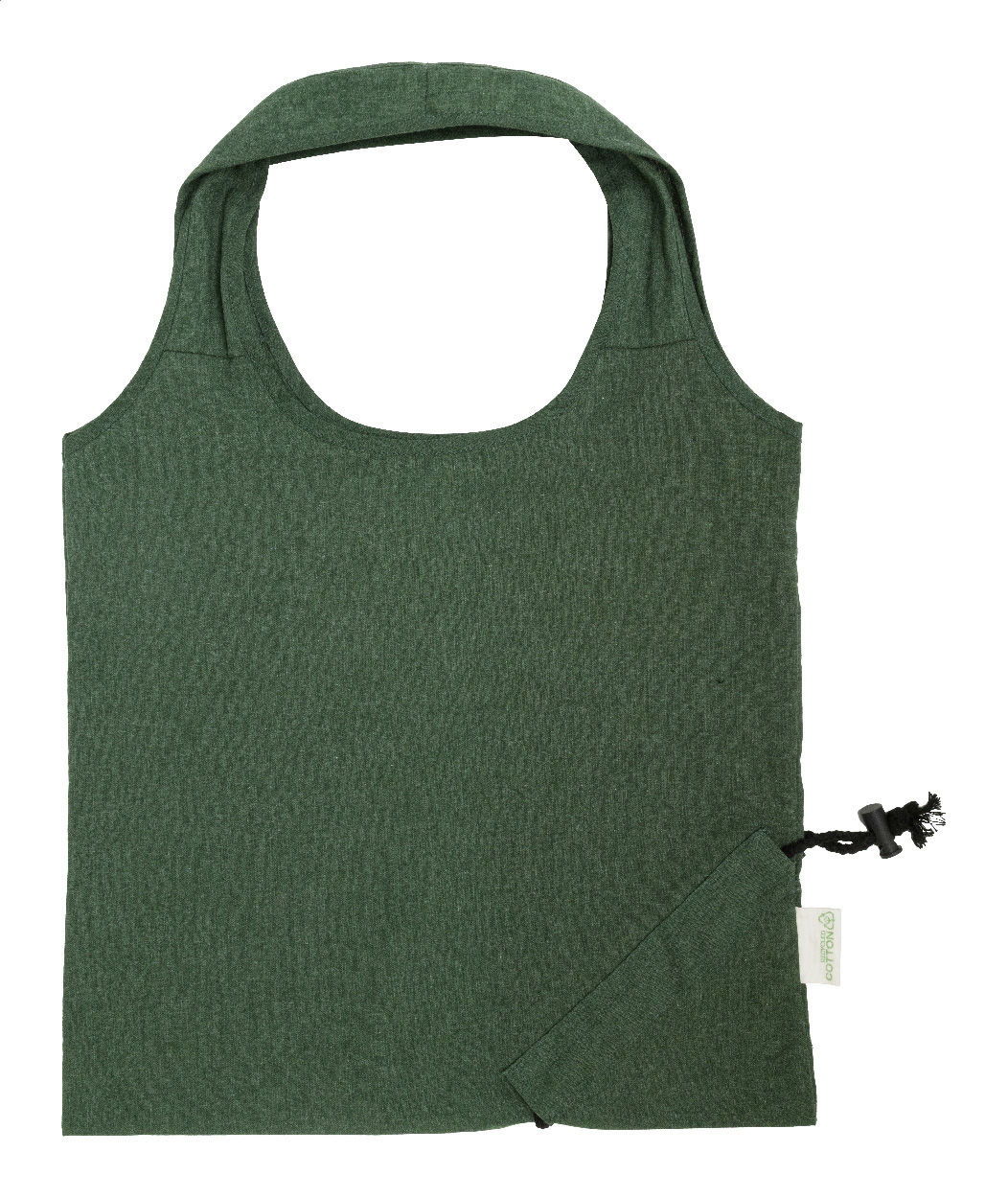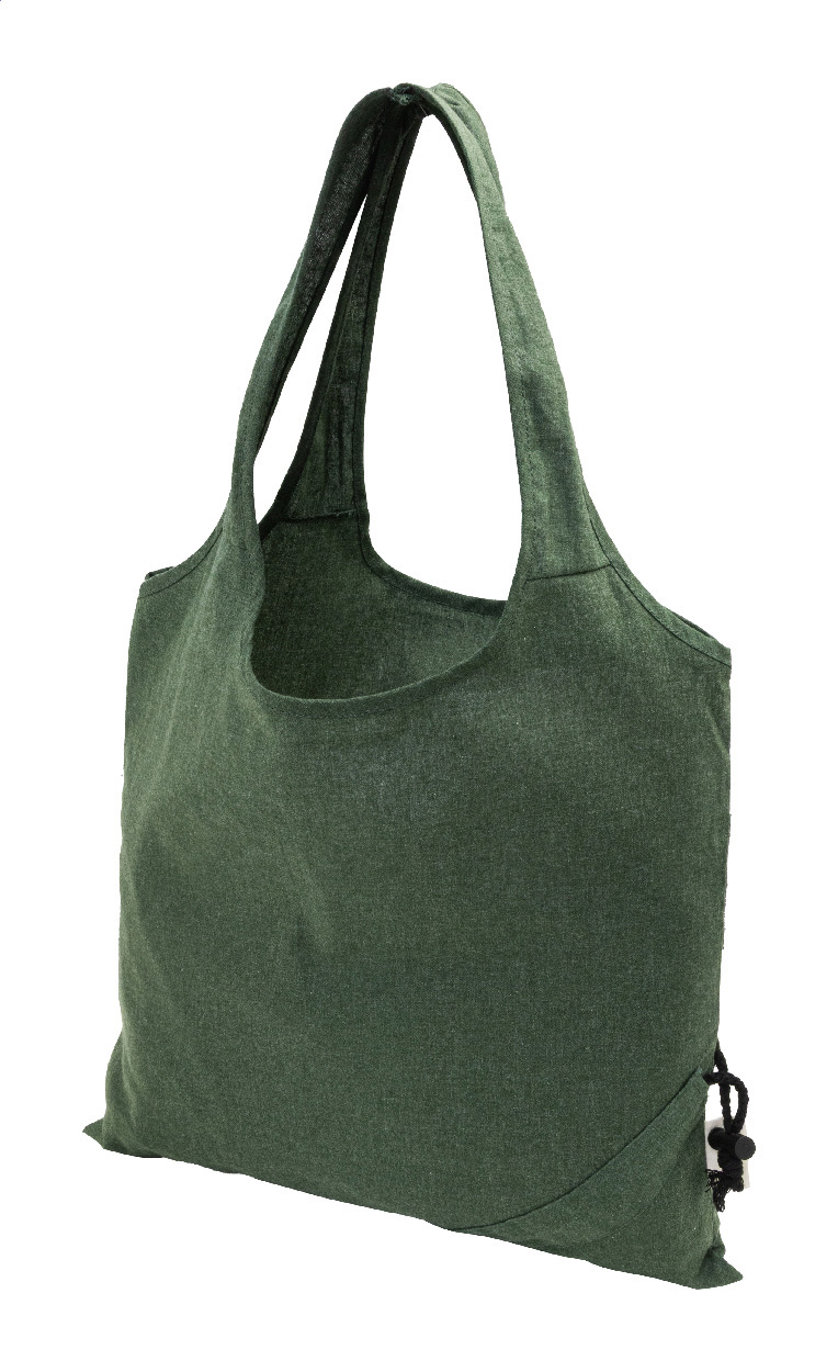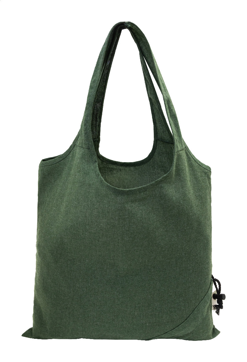 Skládací nákupní taška ze 70 % recyklované bavlny a 30 % polyesteru RPET, 140 g/m². S výrazným štítkem z recyklované bavlny.