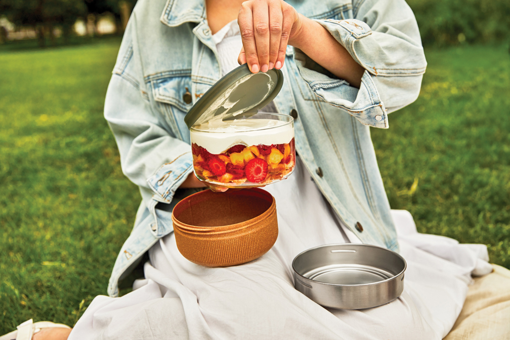 Nepropustná lehká skleněná miska na jídlo. Silikonové víko zabraňuje znečištění při ohřívání v mikrovlnné troubě. Spodní část z odolného PP plastu a dřeva pro pohodlnou manipulaci a zabránění popálení. Šroubovací víko z nerezové oceli zajišťuje nepropustné těsnění. Vhodné do myčky nádobí.