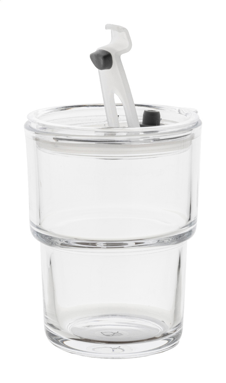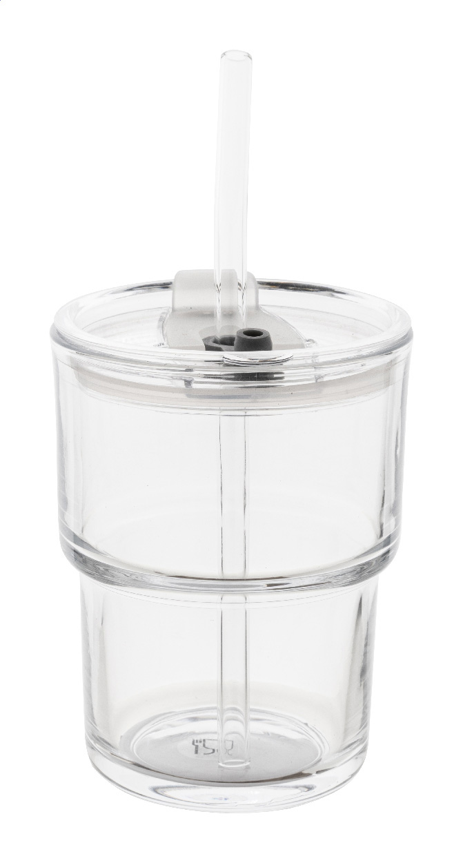 Skleněný cestovní hrnek s plastovým víčkem a skleněným brčkem. 400 ml.