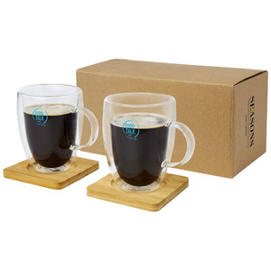 Sada 2 dvoustěnných termálních sklenic s bambusovým podšálkem. Bambus pochází z udržitelných, ekologicky a sociálně odpovědných zdrojů. Díky dvojitému borosilikátovému sklu se teplota nápoje udrží po dlouhou dobu. Objem je 350 ml. Rozměry podšálku: 10 × 10 × 1 cm.