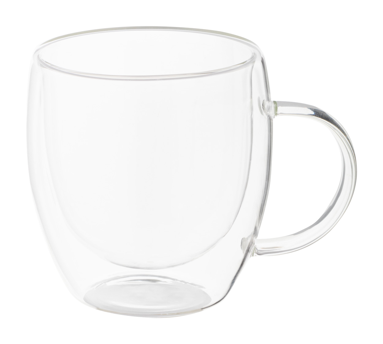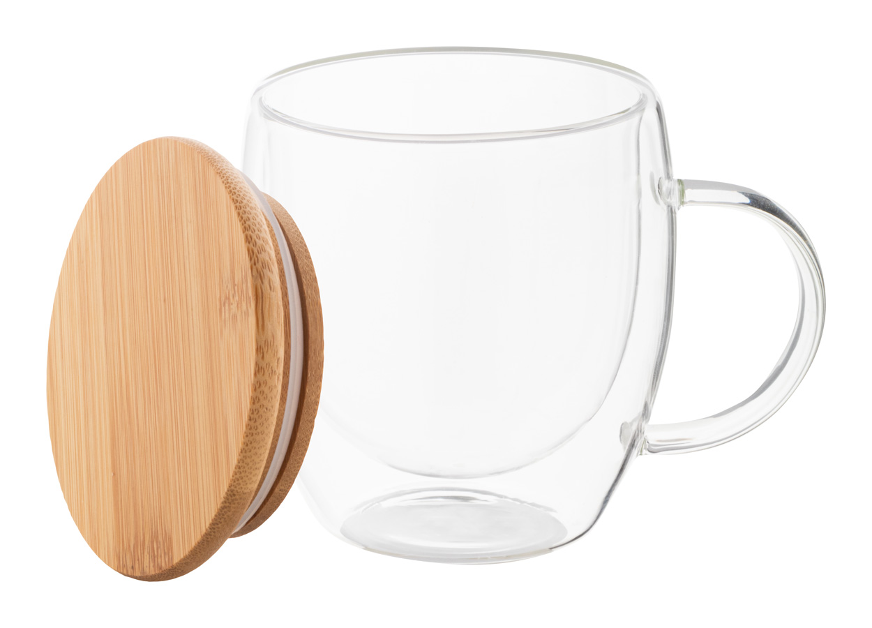 Dvoustěnný termo hrnek z borosilikátového skla s uchem a bambusovým víčkem, 250 ml. V kraftové papírové krabici.