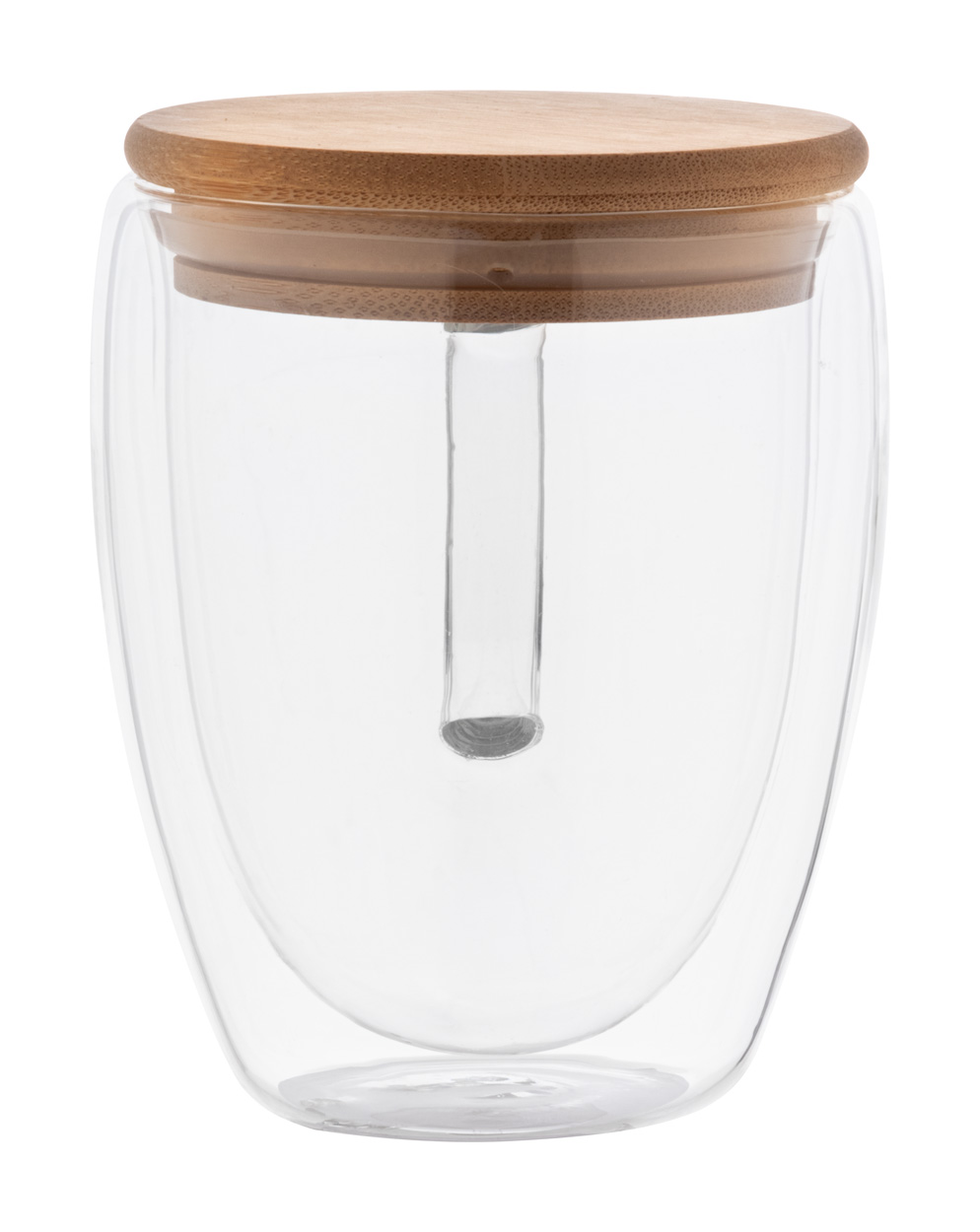 Dvoustěnný termohrnek z borosilikátového skla s uchem a bambusovým víčkem, 350 ml. V kraftové papírové krabici.
