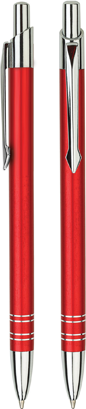 Kovová kuličková propiska v tenkém designu s chromovými doplňky (špička, tlačítko, spona a dva designové proužky na těle propisky). Náplň pera je modrá.