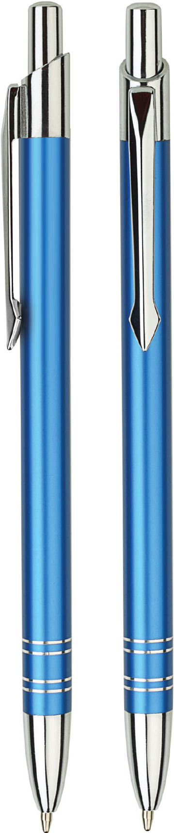 Kovová kuličková propiska v tenkém designu s chromovými doplňky (špička, tlačítko, spona a dva designové proužky na těle propisky). Náplň pera je modrá.