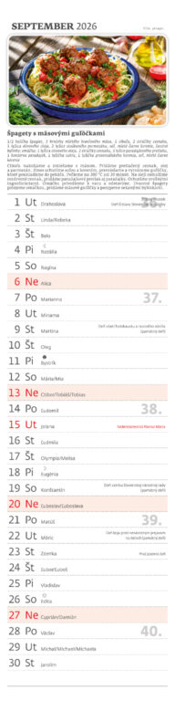 Formát kalendára: 12 x 48 cm Kalendárium: slovenské mesačné menné Rozsah kalendára: 13 listov Väzba: Twin-wire (so špirálou)
