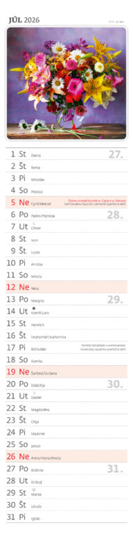 Formát kalendára: 12 x 48 cm Kalendárium: slovenské mesačné menné Rozsah kalendára: 13 listov Väzba: Twin-wire (so špirálou)