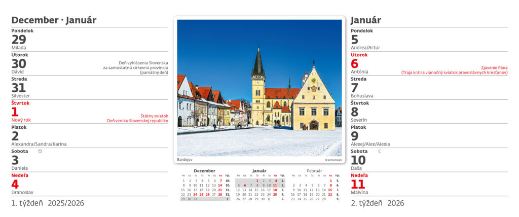 Formát kalendára: 32,1 x 13,4 cm Kalendárium: slovenské dvojtýždenné riadkové Počet strán kalendára: 30 + 2 Stojanček: s plným dnom Priestor na potlač: 32,1 x 3,5 cm