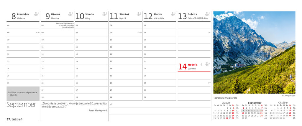 Formát kalendára: 32,1 x 13,4 cm Kalendárium: slovenské týždenné stľpcové Počet strán kalendára: 60 + 2 Stojanček: so zámkom Priestor na potlač: 32,1 x 3,5 cm + dane a ročné obdobia, znamenia zverokruhu, citáty, sviatky v EÚ, 3mesačný prehľad