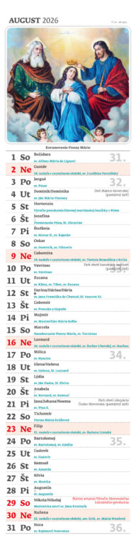 Formát kalendára: 12 x 48 cm Kalendárium: slovenské mesačné menné + katolícke Rozsah kalendára: 13 listov Väzba: Twin-wire (so špirálou)