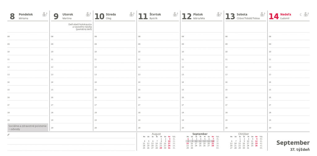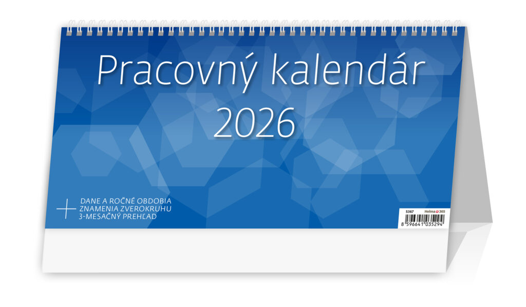 Formát kalendára: 30,1 x 14,8 cm Kalendárium: slovenské týždenné stľpcové Počet strán kalendára: 56 + 2 Stojanček: s plným dnom Priestor na potlač: 30,1 x 3,5 cm + dane a ročné obdobia, znamenia zverokruhu, 3mesačný prehľad
