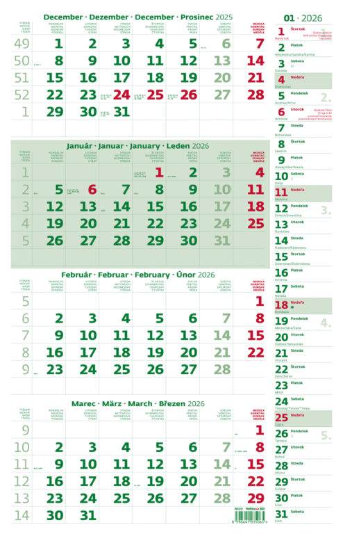 Formát kalendára: 31,5 x 49 cm Kalendárium: slovenské štvormesačné menné + sviatky vybraných európskych štátov (CZ / SK / A / B / D / F / H / CH / I / PL / RUS / UKR) Rozsah kalendára: 12 listov Priestor na prítlač: 31,5 x 7 cm + Od 50 ks dodávame tiež s plnofarebnou potlačou chrbta a hornej laše!