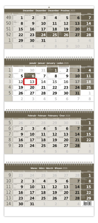 Formát kalendára: 31,5 x 74 cm + 18 cm Kalendárium: slovenské štvormesačné menné + sviatky vybraných európskych štátov (CZ / SK / A / B / D / F / H / CH / I / PL / RUS / UKR) Rozsah kalendára: 4 x 12 listov Priestor na prítlač: 31,5 x 3,5 cm Zložený kalendár: 31,5 x 18,5 cm Vôjde sa do obálky B4 + Od 50 ks dodávame tiež s plnofarebnou potlačou chrbta a hornej laše!