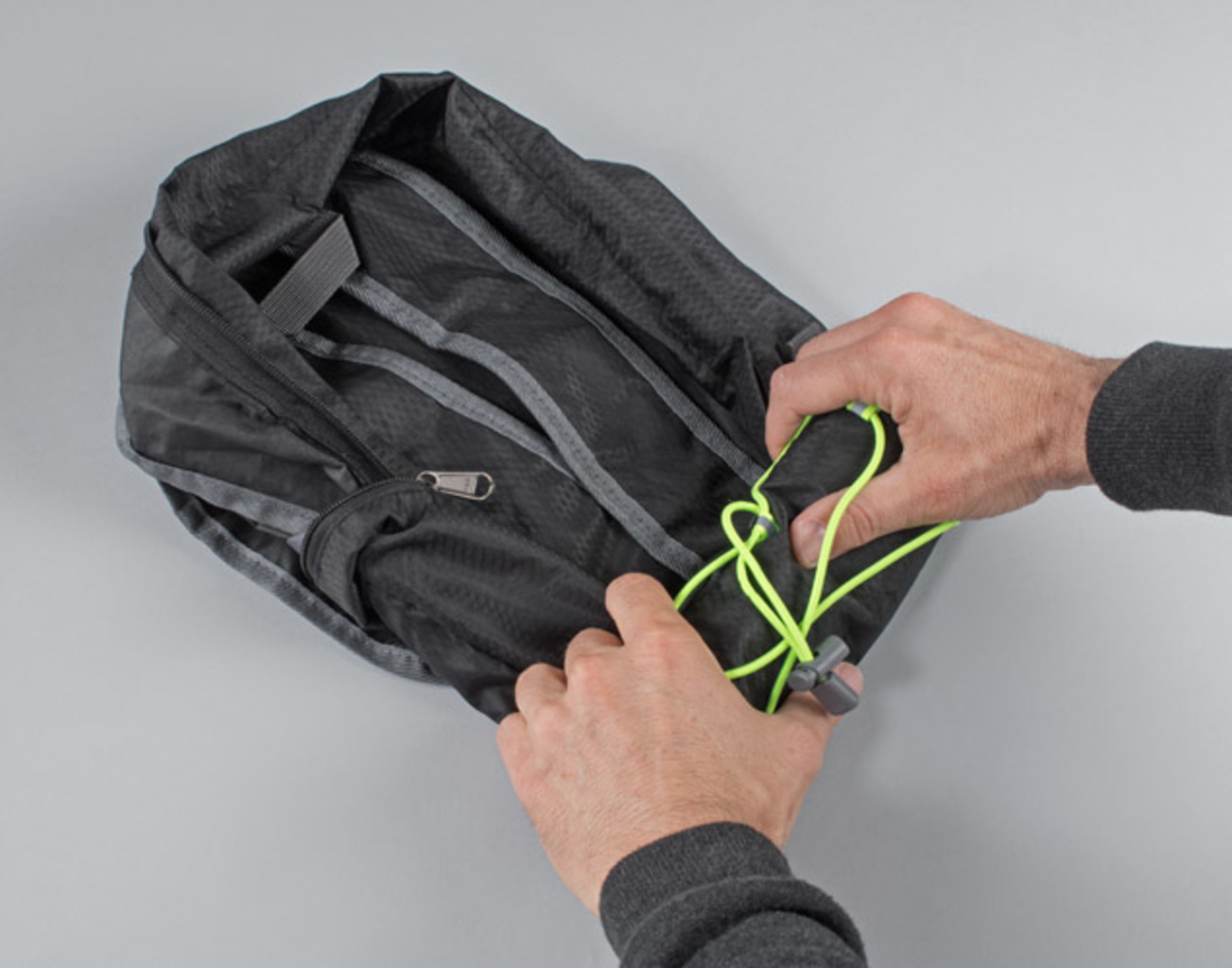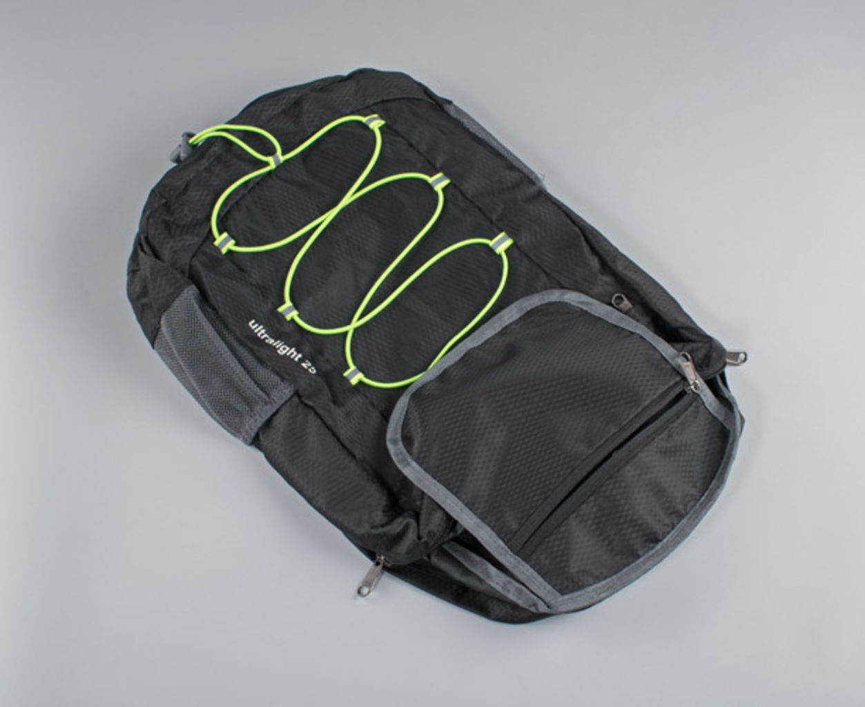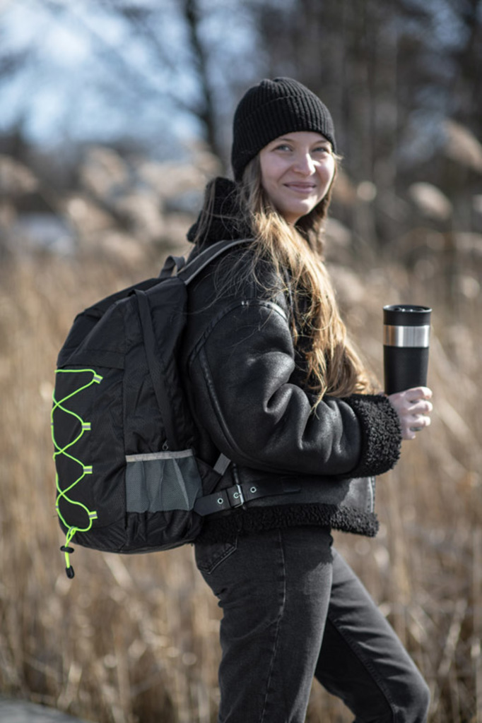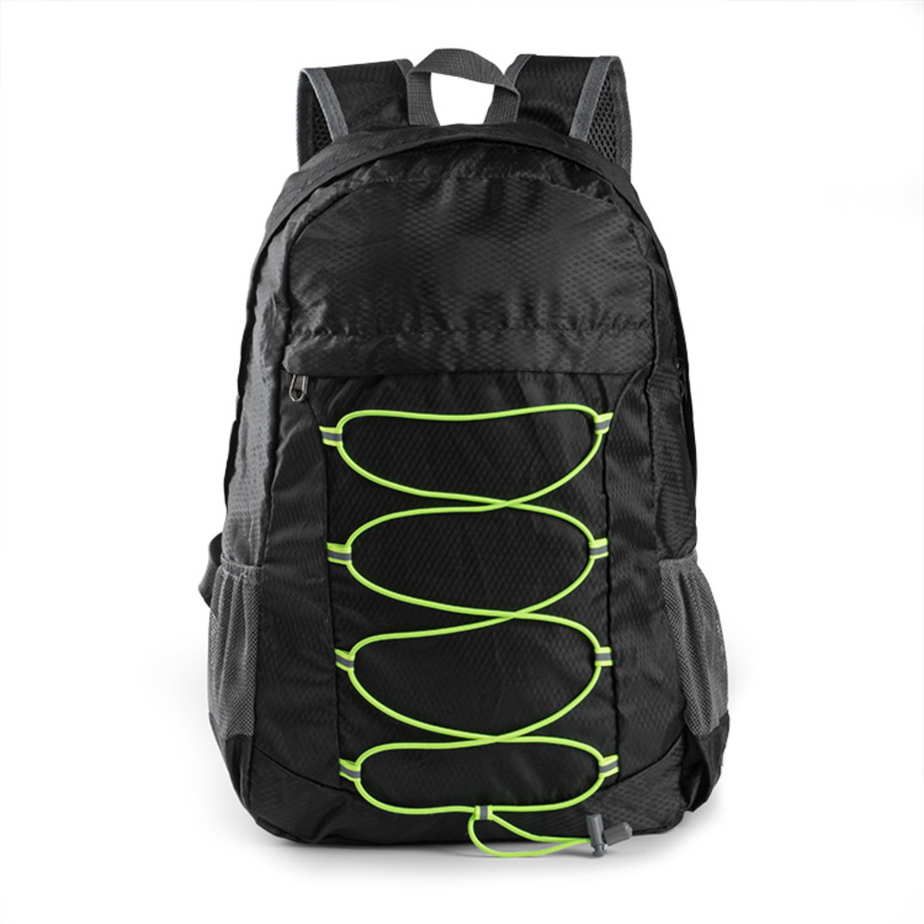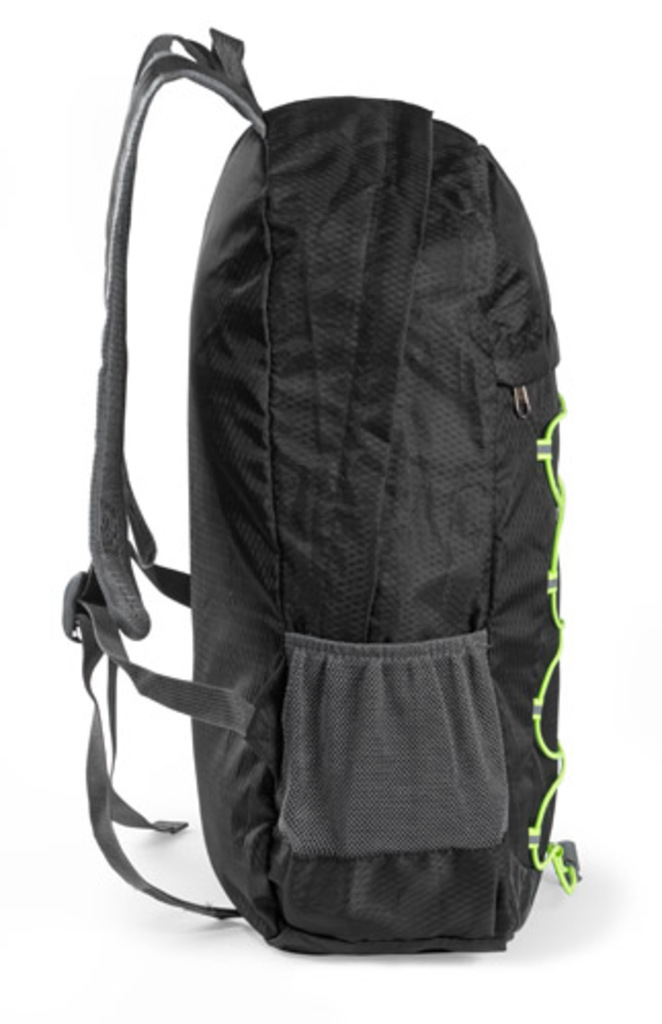 BAKKU batoh vyrobený z polyesteru je lehký a má nosnost až 10 kg. Zelené elastické pásky rozbíjejí dominantní černotu a jsou praktickou součástí během cestování. Další výhodou je možnost složení batohu do malé velikosti, což šetří místo.