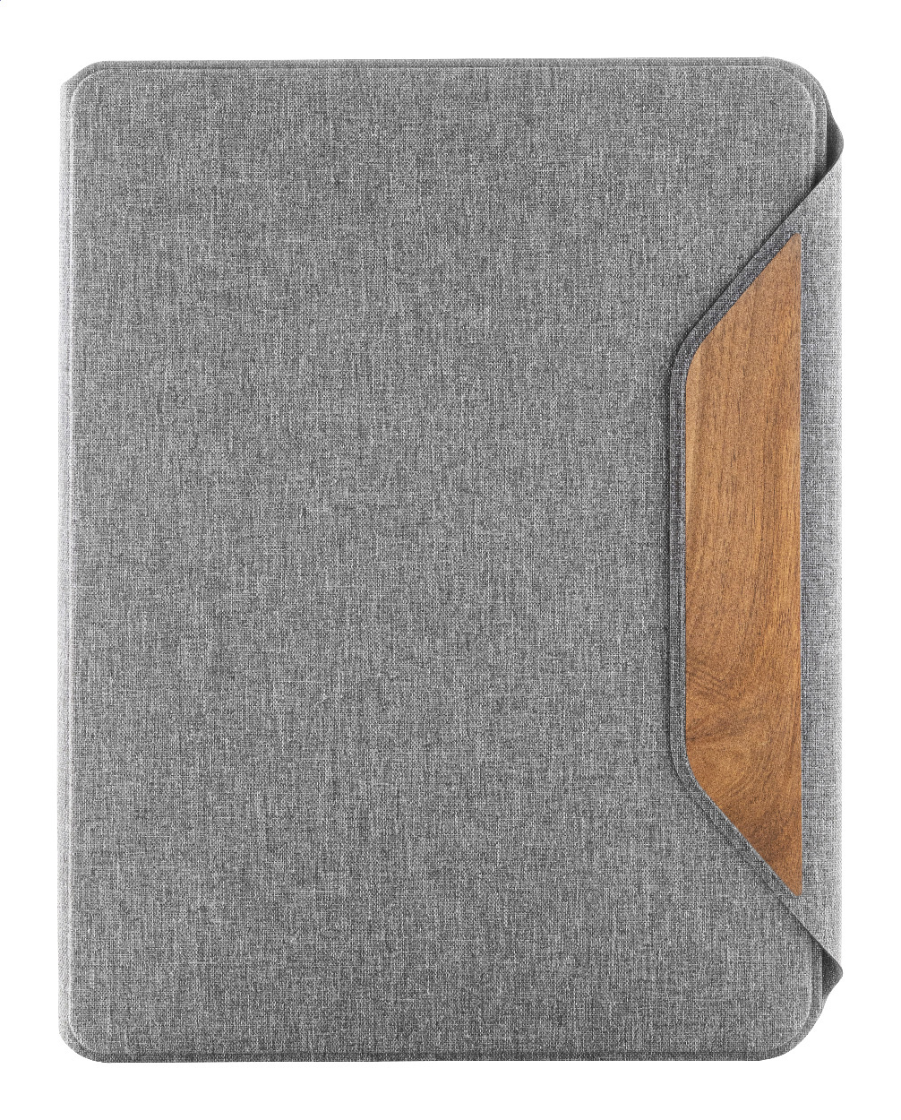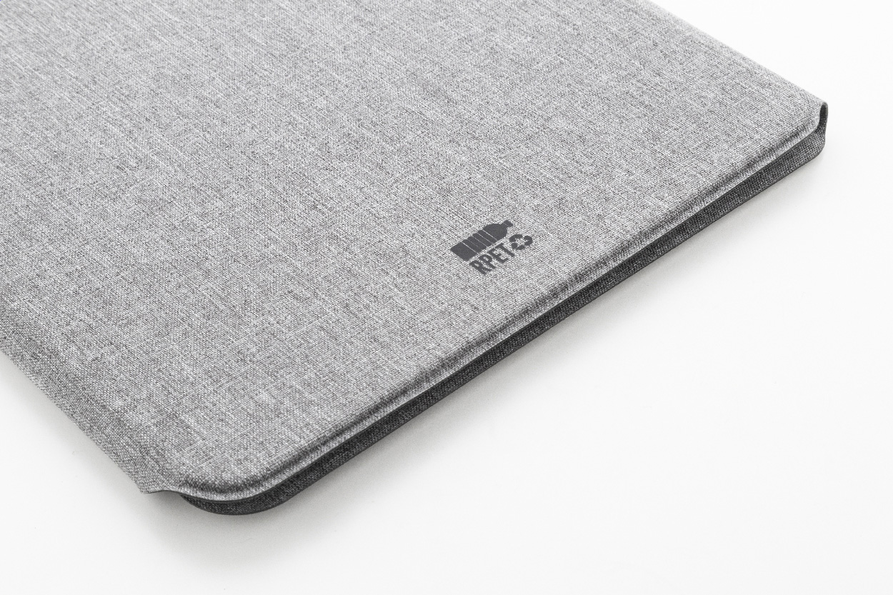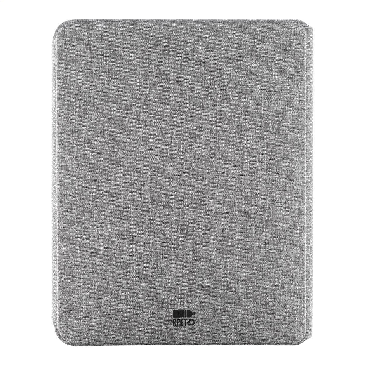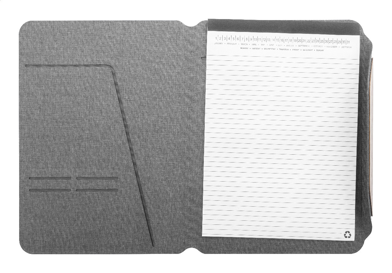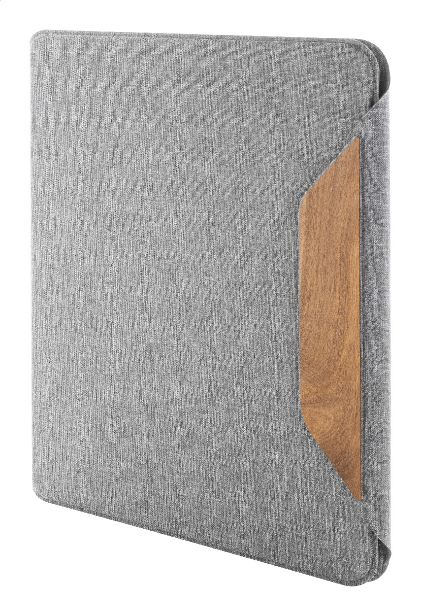 Složka na dokumenty A4 z RPET polyesteru s několika vnitřními kapsami a magnetickým zapínáním s detaily z ořechového dřeva. S linkovaným blokem z recyklovaného papíru s 20 listy.