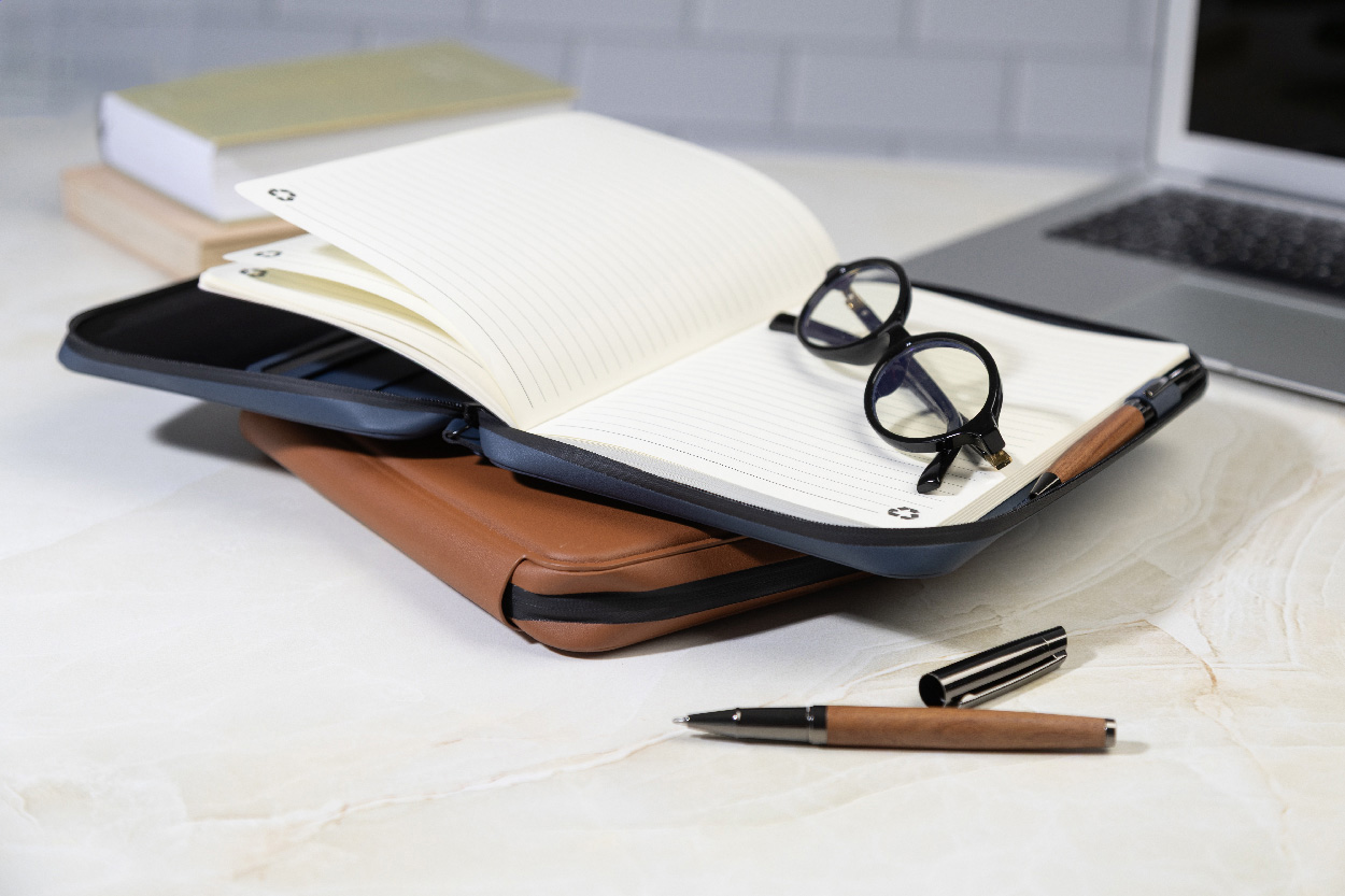 Luxusní složka na dokumenty A5 na zip z recyklované umělé kůže s 64 linkovanými listy a blokem z recyklovaného papíru. S několika vnitřními kapsami na karty a dokumenty.