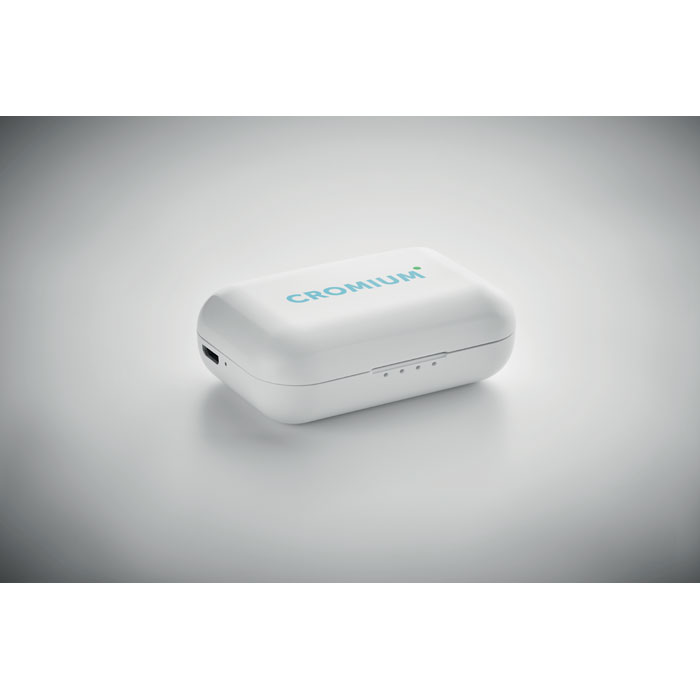 Sada 2 sluchátek ''True Wireless Stereo'' (TWS) 5.3 s mikrofonem a vestavěnou baterií 30 mAh. Doba přehrávání přibližně 3 hodiny. Automatické párování. Včetně nabíjecího kabelu micro USB a nabíjecí stanice 185 mAh.
