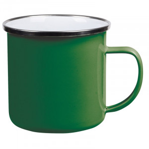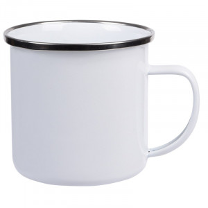 Smaltovaný hrnek na pití z nerezové oceli, s uchem, barevný vnějšek s bílým vnitřkem, stříbrný nerezový okraj, objem cca 350 ml.