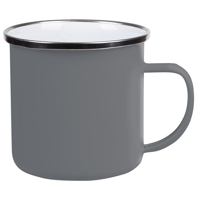 Smaltovaný hrnek na pití z nerezové oceli, s uchem, barevný vnějšek s bílým vnitřkem, stříbrný nerezový okraj, objem cca 350 ml.