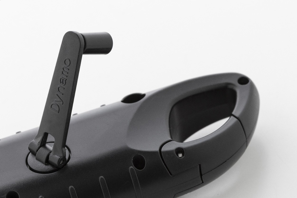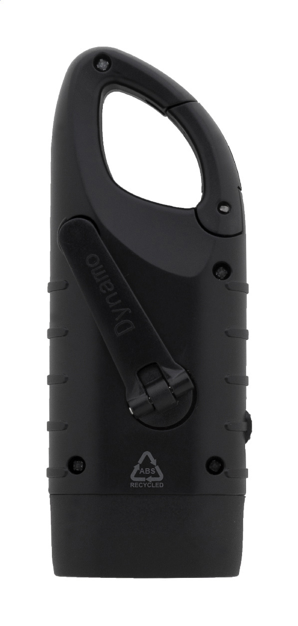 Baterka z recyklovaného ABS plastu se 3 LED diodami, vestavěnými solárními a dynamovými nabíječkami a karabinou.