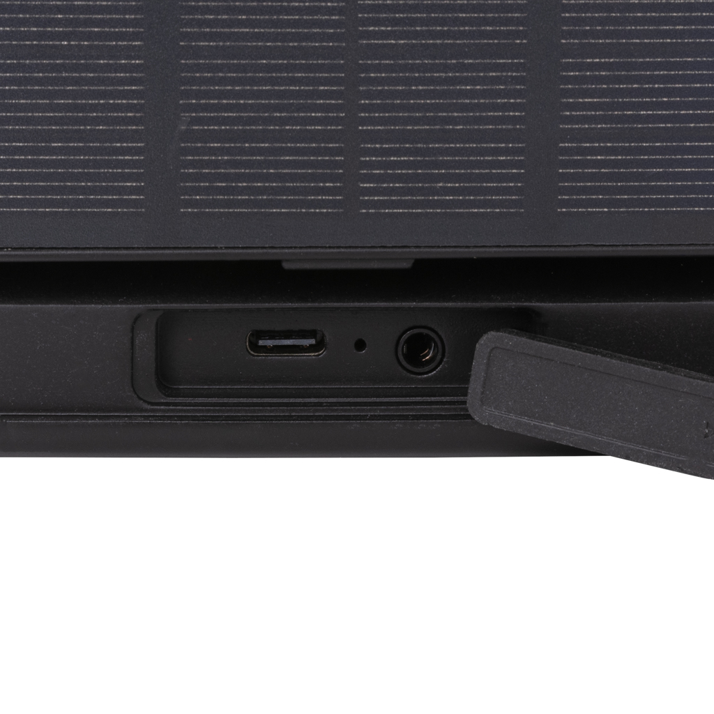 Výkonný 12 W bezdrátový reproduktor s integrovaným velkým solárním panelem. Panel využívá vysoce kvalitní monokrystalické solární panely s konverzním poměrem 19 %. Rychlost solárního nabíjení: 5V/300 mA. Stupeň nabíjení vždy závisí na slunečních podmínkách. Baterie s kapacitou 2 000 mAh zajišťuje poslech po dobu až 8 hodin. BT 5.3 pro optimální bezdrátové připojení na vzdálenost až 10m. Mikrofon pro telefonování. Zabudované LED světlo. Vyrobené z RCS recyklovaného ABS. RCS (Recycled Claim Standard) je globální standard, který umožňuje ověřit použití recyklovaného materiálu v produktu napříč celým dodavatelským řetězcem. Celkový podíl recyklátu dle váhy produktu: 16 %. Včetně nabíjecího kabelu z RCS recyklovaného TPE. Baleno v FSC dárkovém balení.