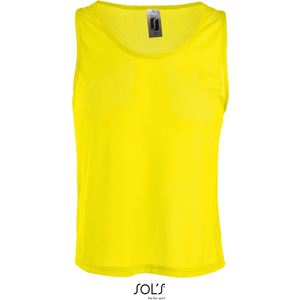 Kulatý výstřih lemovaný tón v tónu, neonové barvy pro dobrou viditelnost během nočního tréninku, pratelné na 40°, nelze sušit v sušičce
