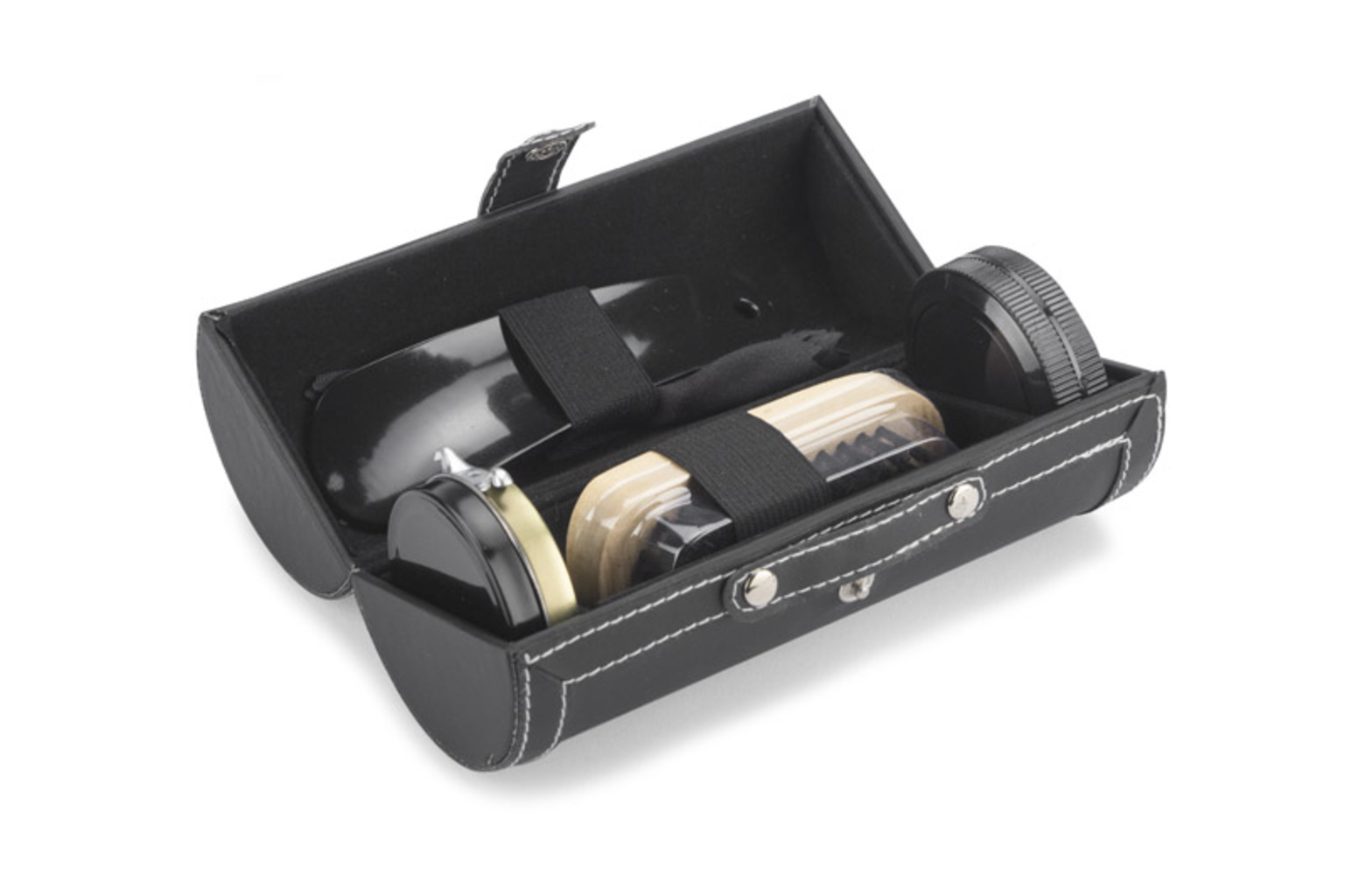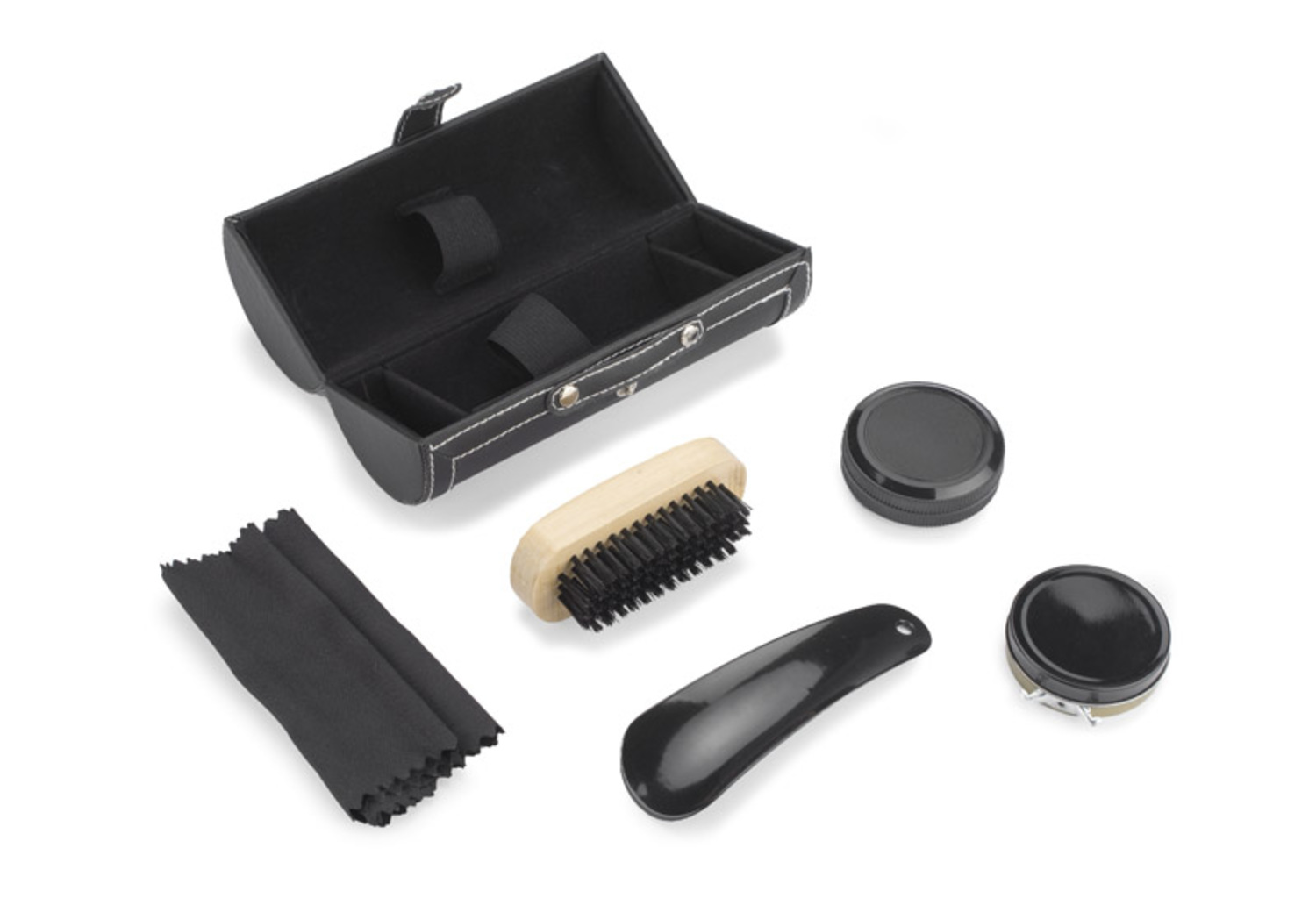 Sada na čištění obuvi SHINBO z materiálu podobného kůži (PU). Obsahuje průhledné leštidlo, čisticí prostředek, lžíci na boty, hadřík a kartáček.
