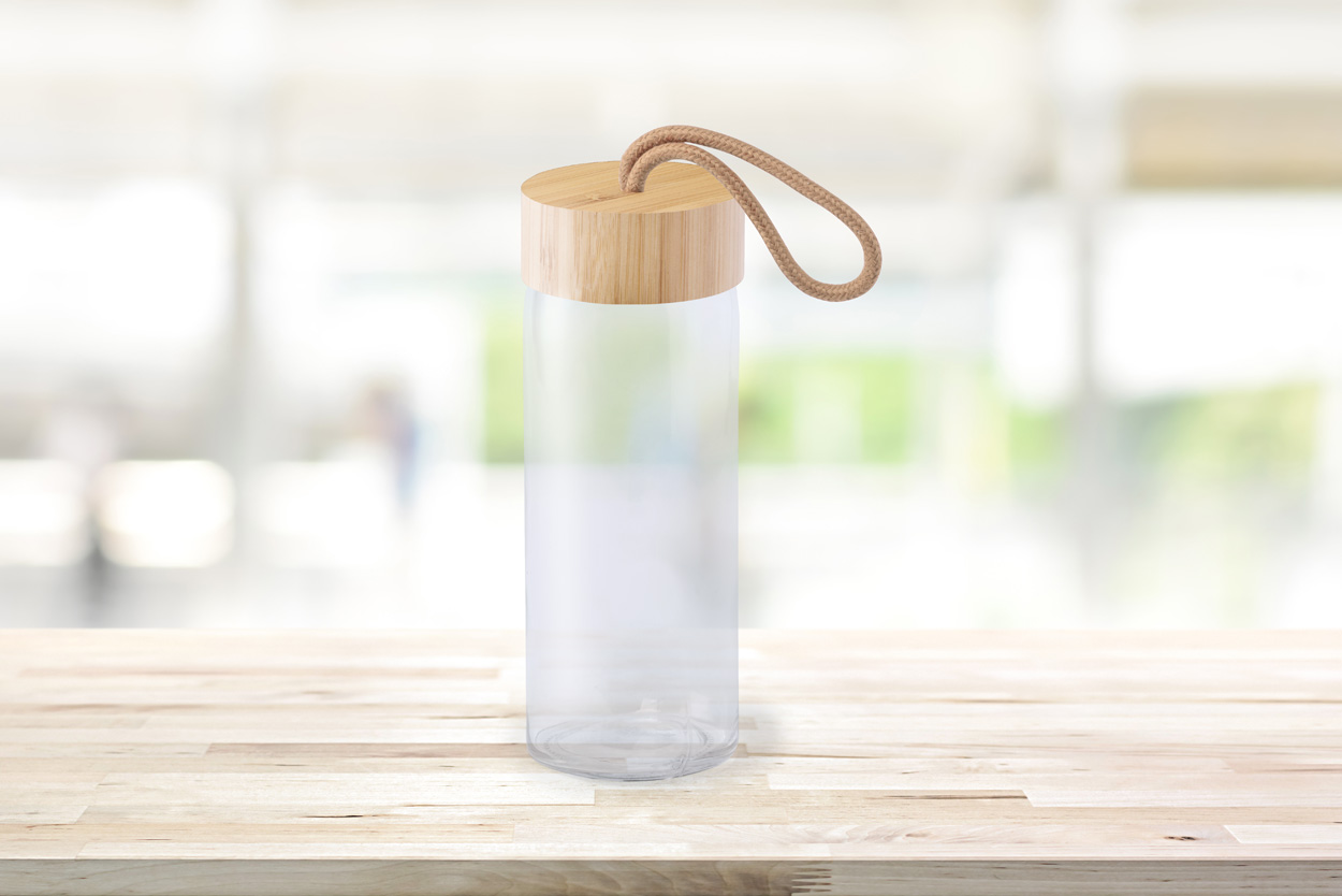 Skleněná sportovní láhev s bambusovým víčkem, 430 ml. V dárkové krabičce. Nevhodné pro sycené nápoje.