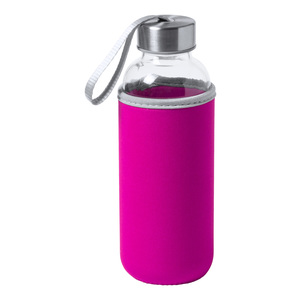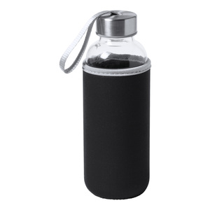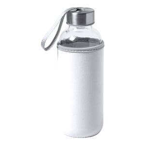 Skleněná sportovní láhev s páskem na víčku a barevným neoprenovým obalem, 420 ml. Nevhodné pro sycené nápoje.