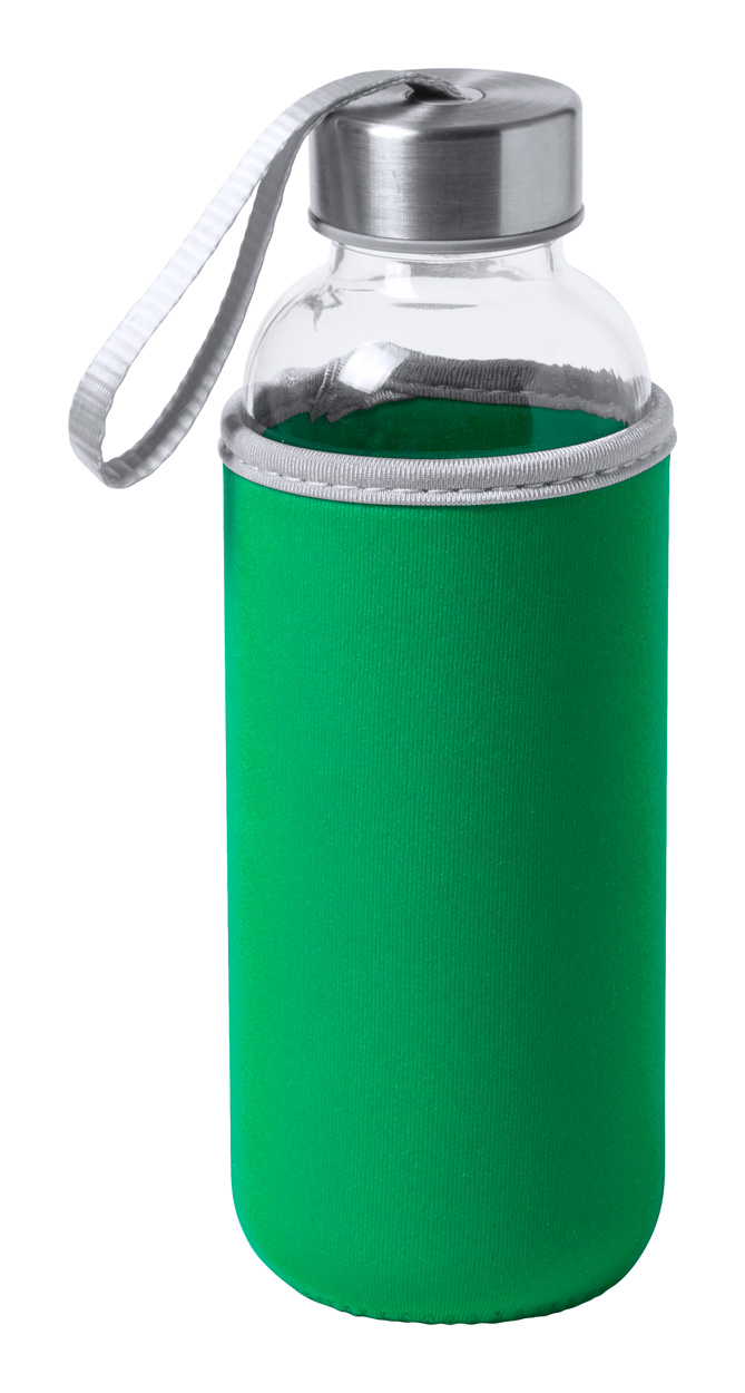 Skleněná sportovní láhev s páskem na víčku a barevným neoprenovým obalem, 420 ml. Nevhodné pro sycené nápoje.