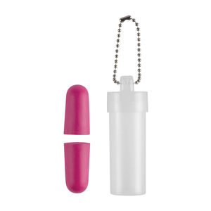Barevné špunty do uší z EVA materiálu v transparentní plastové krabičce s kovovým řetízkem.