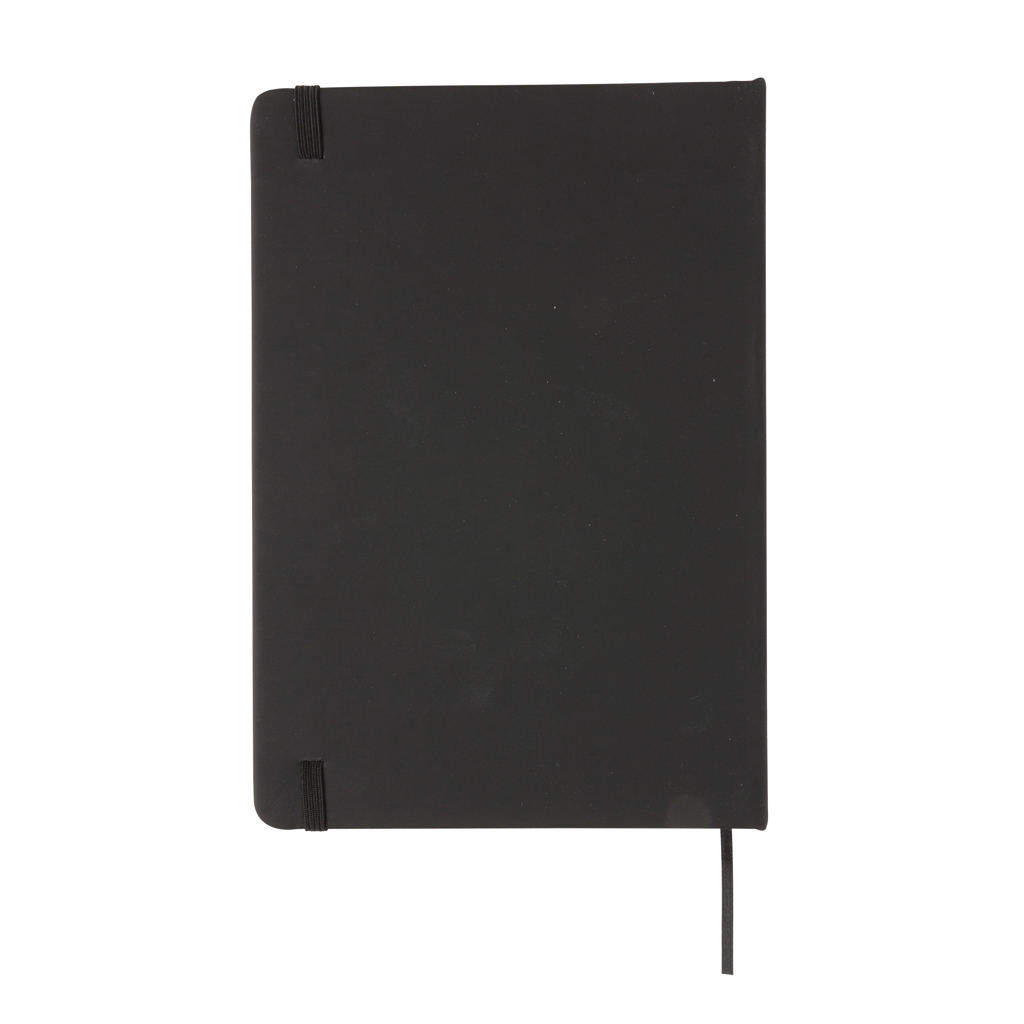 Klasický linkovaný poznámkový blok A5 v pevných deskách z PU s elastickou gumičkou a záložkou z černé stužky. Se 144 stranami krémového papíru s gramáží 70 g/m².