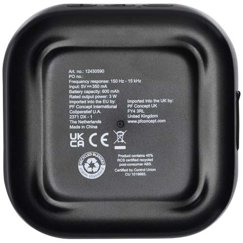 3W Bluetooth® reproduktor z recyklovaného RCS, který přehrává hudbu, podcasty atd. z jakéhokoli zařízení podporujícího technologii Bluetooth®, takže je ideálním společníkem pro každou příležitost. Reproduktor je vybaven vestavěným ovládáním hudby a mikrofonem pro telefonní hovory a online schůzky. Vychutnejte si až 3–4 hodiny hudby při maximální hlasitosti. Doba nabíjení činí 3 hodiny. Bluetooth® 5.3 s pracovním dosahem přibližně 10 metrů. Dodáváno s uživatelskou příručkou a 30cm nabíjecím kabelem USB-A na Typ C a zabaleno ve 100% recyklované kartonové krabici z udržitelných zdrojů.